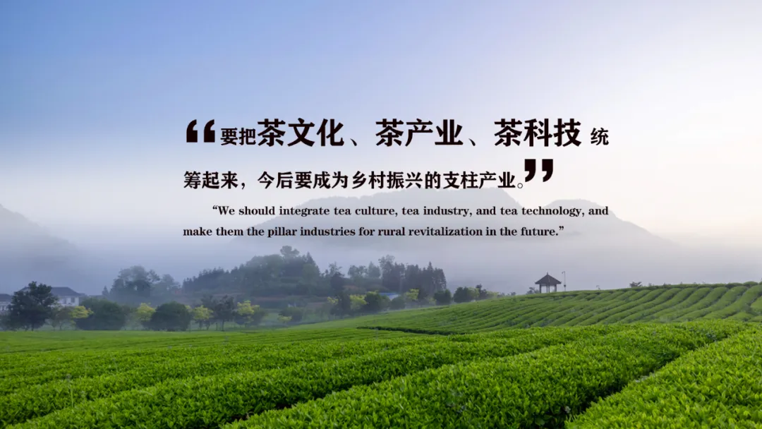 我们主席在2021年3月22去到福建武夷山考察的时候,为茶代言说的一句话:“要把茶文化、茶产业、茶科技统筹起来,今后要成为乡村振兴的支柱产业”。这一表述,体现了国家对茶产业在乡村振兴中发挥重要作用的规划,强调通过整合茶文化的精神价值、茶产业的经济价值以及茶科技的创新驱动,推动茶产业成为乡村振兴的支柱产业。