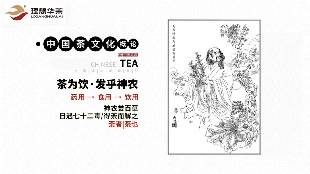 而且茶,它有一个解毒的功效,为什么当我们去到医院拿到药的时候,那医生会告诉你用这个白开水服用,因为今天的茶它具有解毒的功效,所以呢,也有一句话叫:日遇七十二毒,得茶而解之。神农尝百草,传言炎帝神农氏尝百草源于上古时期,当时人类依赖狩猎和采集为生,常因误食毒草或患病而死之,神农氏作为部落首领,为解决百姓疾苦,决心亲自尝草木以区分可食用与药用植物,神农发现咀嚼嫩叶可清除体内毒素,将其命名“查”即茶),成为后世解毒良方。