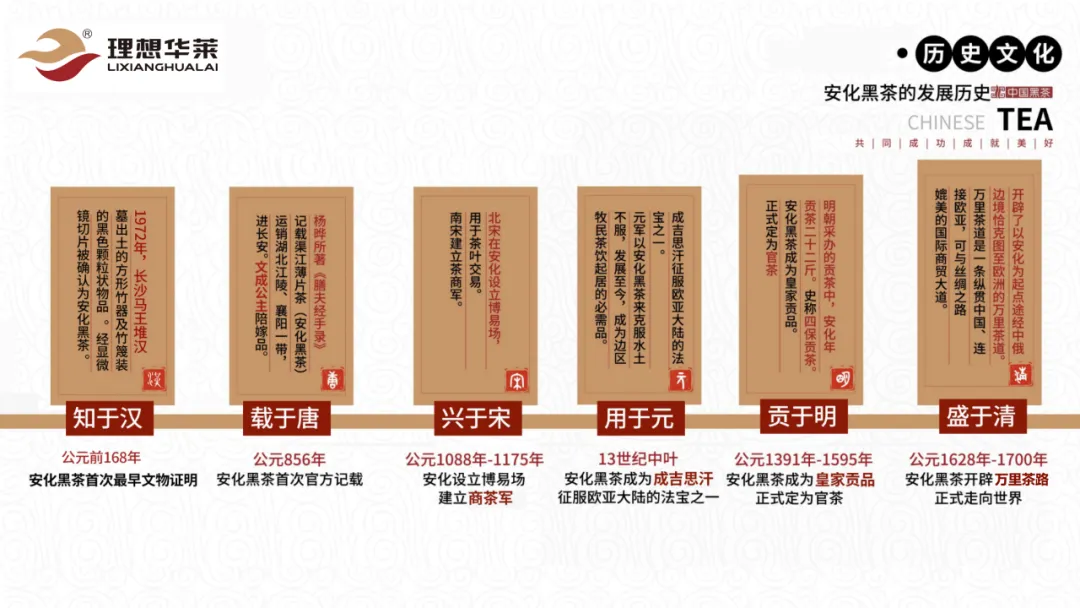 安化黑茶历史 :起源于汉朝,发展于唐朝,兴于宋朝,用于元朝,贡于明朝,胜于清朝。成吉思汗在欧亚大陆扩张时,依靠安化黑茶解决士兵水土不服问题。我们的这款产品,始于唐朝兴于宋,那么在最早的时候呢,在我们用于大家听到一段佳话叫成吉思汗统战欧亚大陆,创版图之最的时候,那么他带的其中六大法宝之一是我们的安化黑茶,因为可以解士兵的水土不服,而当那个年代的时候,你用银子是买不到汗血宝马的,只有用我们的茶叶去兑换。明朝的时候呢,我们的安化黑茶又成为了贡茶,皇家贡茶正式地定为了官茶,那当清朝的时候,我们的安化黑茶又开辟了万里茶道,我们经常是不是听到一句话叫王子犯法,与庶民同罪,那这段佳话从何而来呢?就是当时朱元璋的女婿,因为当时在那个年代,官场规定官茶不可以贩卖,只要贩卖到1万斤,那么你是犯法的,而当时的朱元璋女婿贩卖了10万斤的安化黑茶,那当朱元璋在选择女婿和法律之前,他选择砍了自己女婿的头,所以有了这么一段佳话,叫王子犯法与宿民同罪。