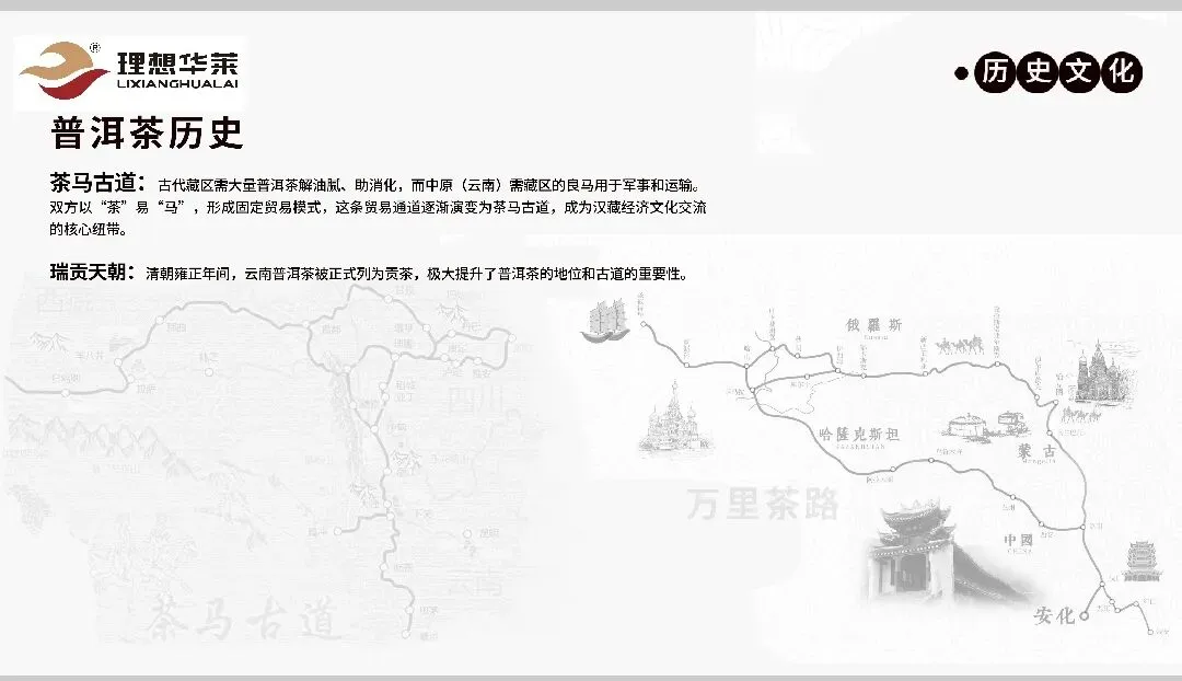 普洱茶历史 :清朝雍正年间被列为贡茶,通过茶马古道传播。普洱茶名声较大,但因收藏炒作而偏离直销路线。