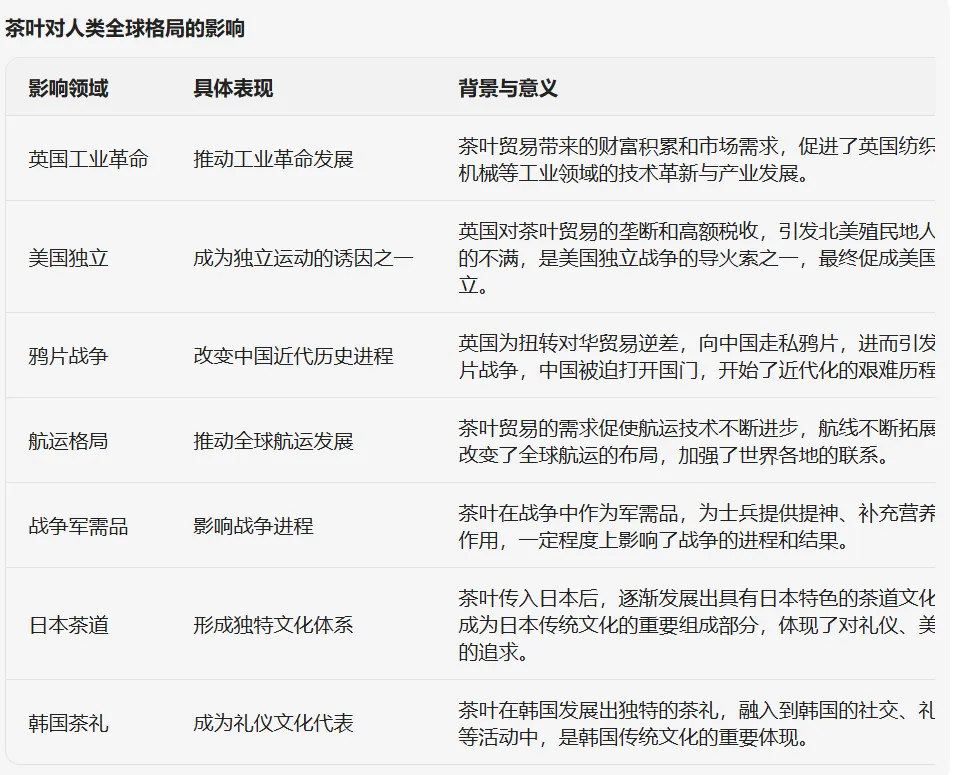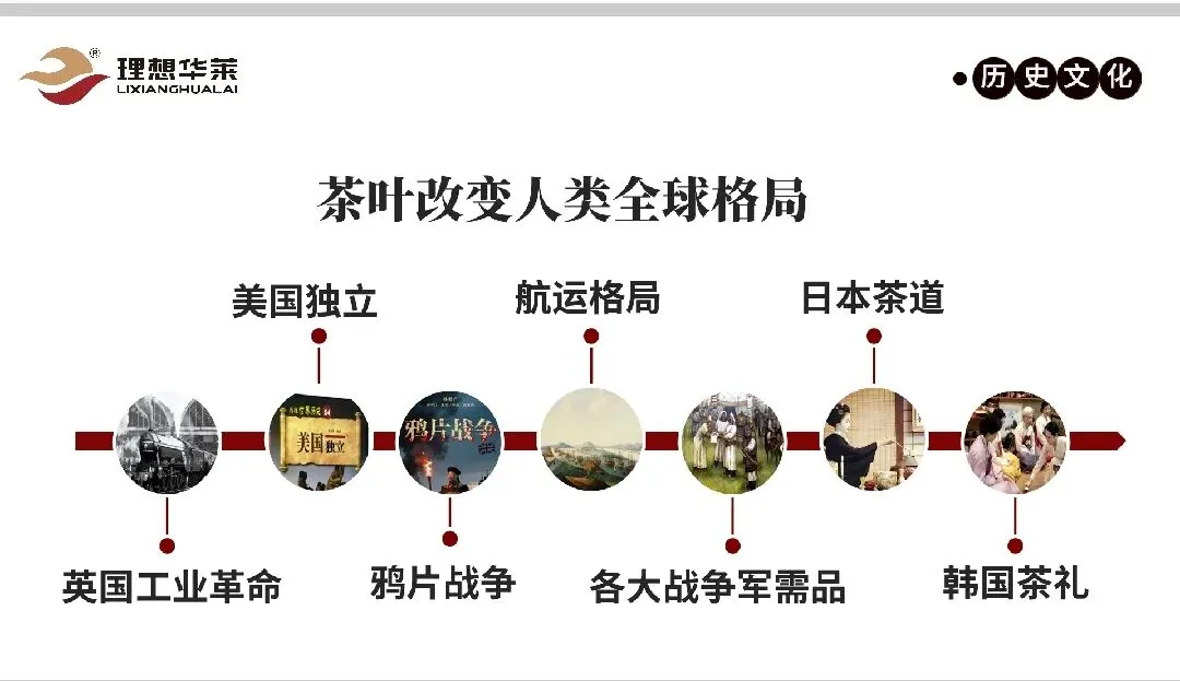 全球影响 :茶改变全球格局,如英国工业革命、美国独立、鸦片战争等事件中,中国黑茶发挥关键作用。例如,鸦片战争源于茶叶贸易失衡。 丝绸之路(汉代)、海上丝绸之路和万里茶路(清代)将茶传播到欧美,郑和下西洋首次将中国茶带出国门。