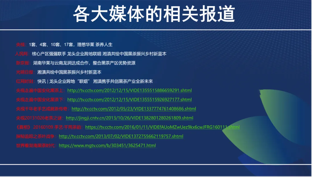 央视一套、四套、十七套报道“理想华莱茶养人生”;人民日报、人民网、光明日报、央视走遍中国等平台发布六个必看视频,覆盖茶历史和公司背景。例如,2012年央视二台财经报道50分钟专题,对比公司发展。