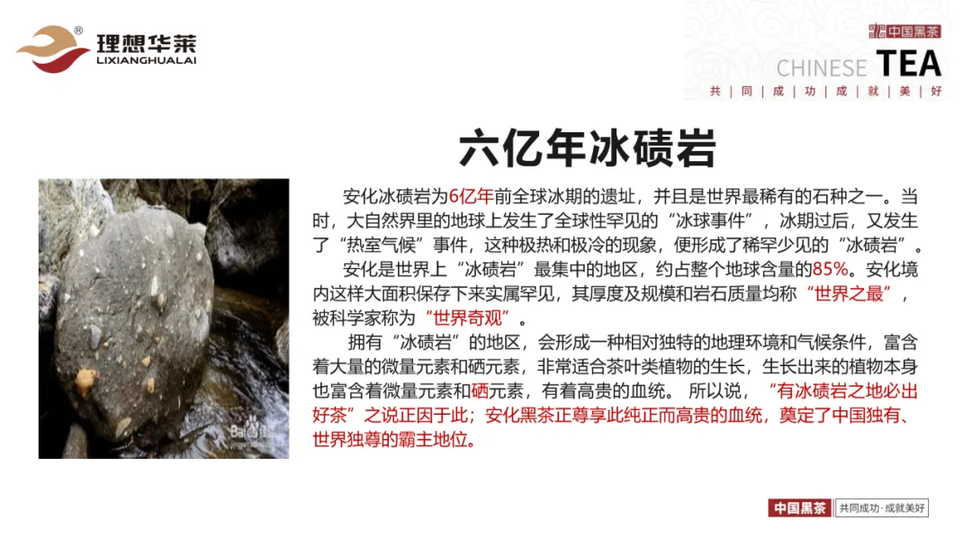 源于6亿年前的冰碛岩,那6亿年前的冰碛岩是一个极冷极热,自然罕见的一个现象形成的一款石头,而这款石头呢,经过了6亿年的这种土壤风化,它上面长出来的茶叶是全世界茶叶平均值的7倍,它的微量元素高达480多种,那么这种冰碛岩它有一个名字,俗称叫“长寿食”,“吉祥石”。已成为安化奇石,视为珍宝拥有不可估量的价值。 在整个全球,85%是在安化经历的,还有15%在南非,所以我们经常喝的一款咖啡豆南山咖啡星巴克也是非常独一无二的。