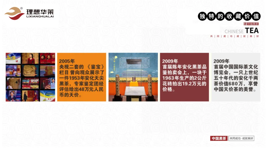其中有一个鉴宝栏目,中央二台的鉴宝栏目,1953年的天尖拍到了48万的价格,那么在2021年的黑茶文化节上,1958年的3公斤的茯砖茶拍到了110万的价格,在09年的茶叶博览会上,一款上世纪的千两茶拍到了680万的价格,所以享誉了天价茶的美誉。安化黑茶也有了一个能喝的古董,也叫软黄金、白金、铂金,不如我们的黑金,那黑金就是我们茶里面的金花。