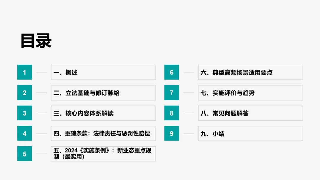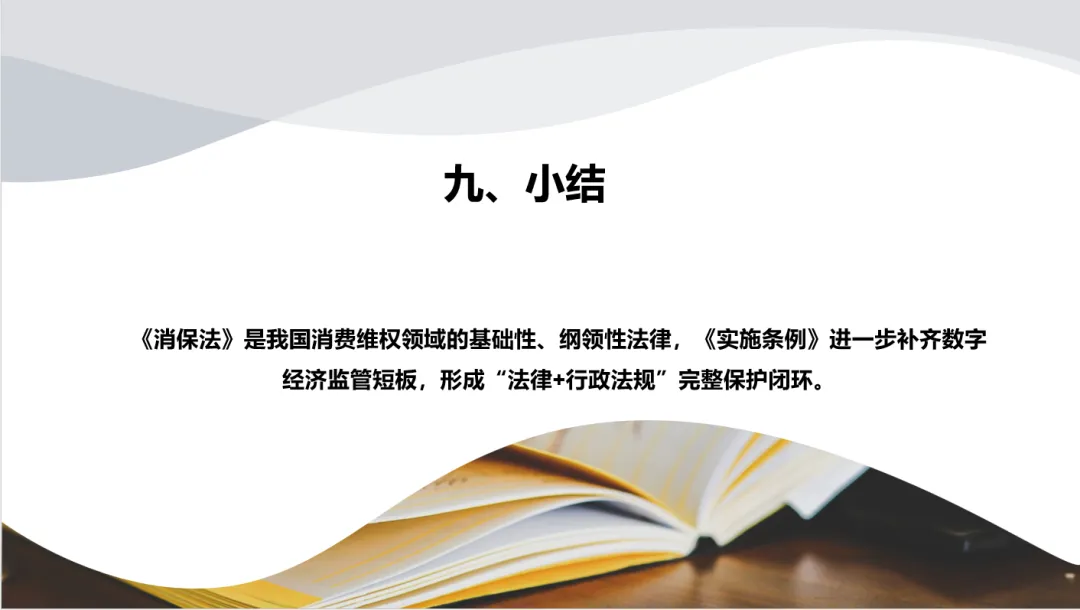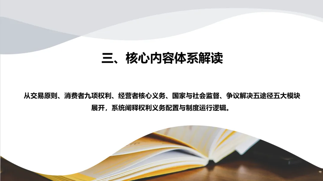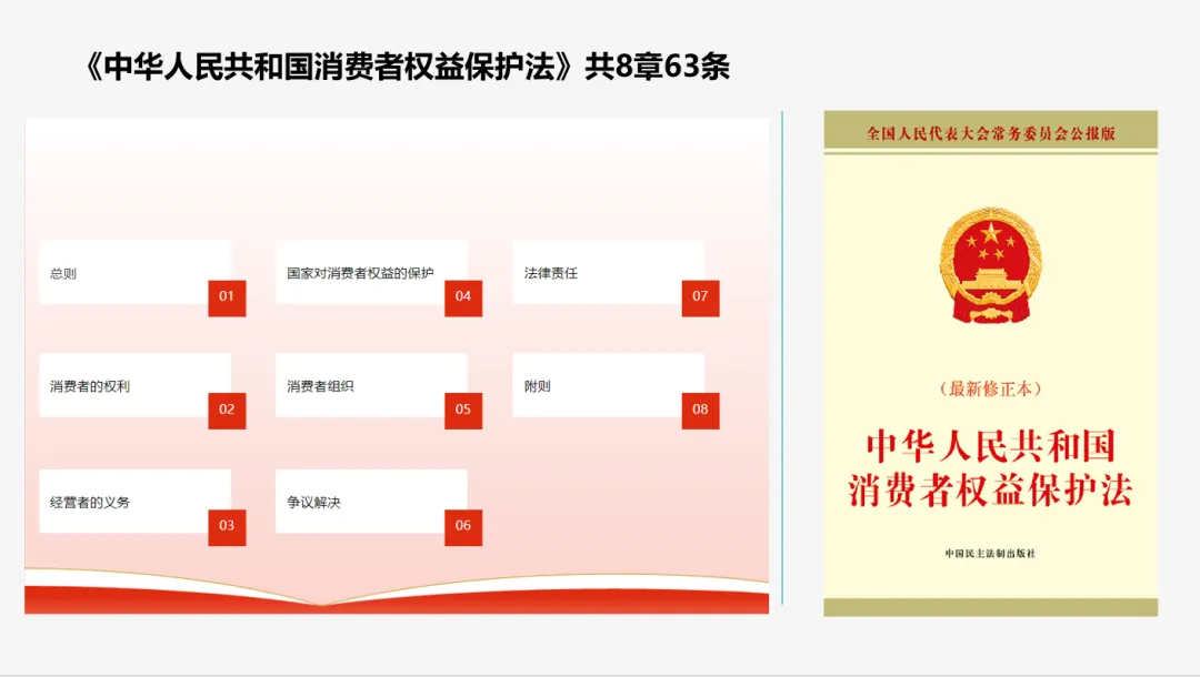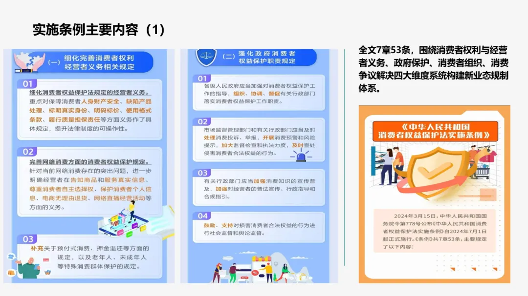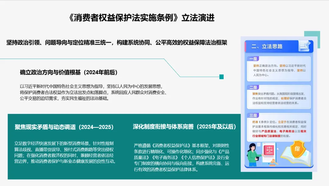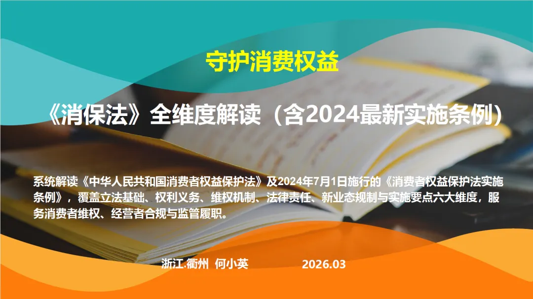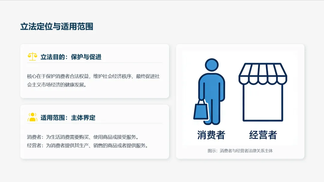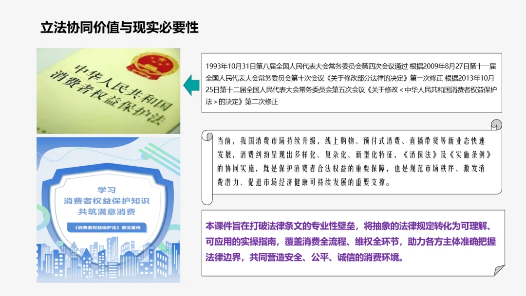本课件基于《中华人民共和国消费者权益保护法》(下称《消保法》,1993年10月31日第八届全国人民代表大会常务委员会第四次会议通过、2013年10月25日第十二届全国人民代表大会常务委员会第五次会议修正),结合2024年7月1日正式施行的《消费者权益保护法实施条例》(国务院第778号令),全面立足我国消费市场发展现状,兼顾传统消费与数字消费、线下消费与线上消费的多元场景,从立法框架、核心权利义务、维权机制、法律责任、新业态规制、实施要点六大核心维度,进行系统、可落地的深度解读,既明确法律条文的核心内涵,又结合典型场景拆解实操要点,为消费者依法维权、经营者合规经营、监管部门履职监管提供清晰指引。
