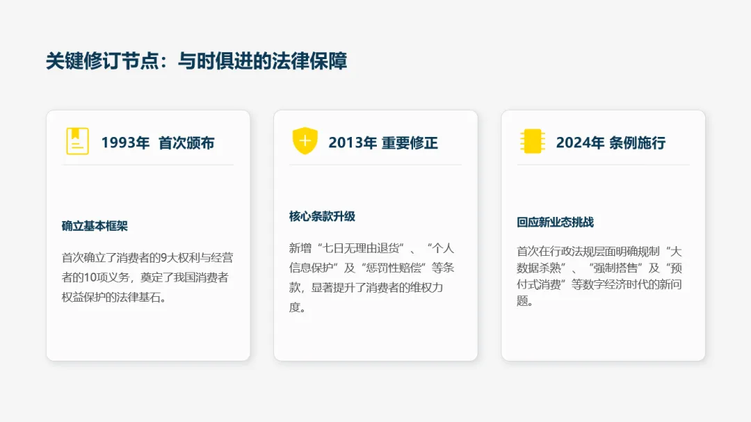 《消保法》的修订与完善,始终紧跟我国消费市场的发展变化,聚焦消费者反映最强烈的痛点难点问题,逐步构建起全方位、多层次的消费权益保护体系,三个关键修订节点具有里程碑意义: