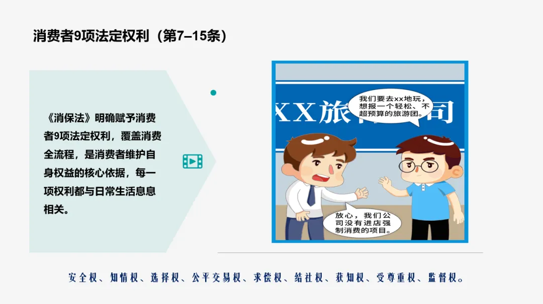 《消保法》明确赋予消费者9项法定权利,覆盖消费全流程,是消费者维护自身权益的核心依据,每一项权利都与日常生活息息相关,具体解读如下: