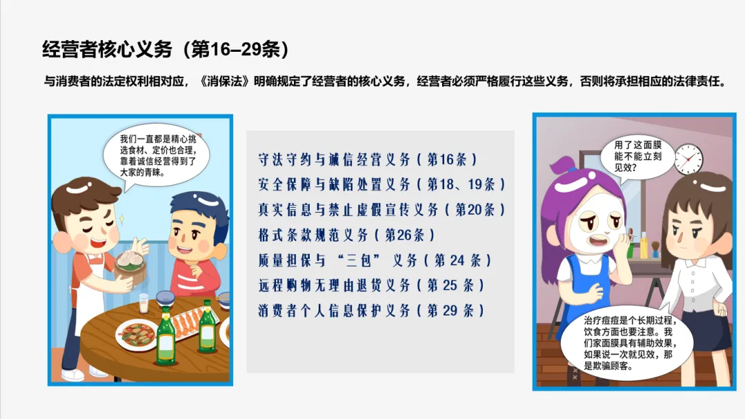 与消费者法定权利相对应,《消费者权益保护法》(以下简称《消保法》)明确规定经营者应当履行的核心义务,经营者未依法履行义务的,应当承担相应法律责任。具体义务如下: