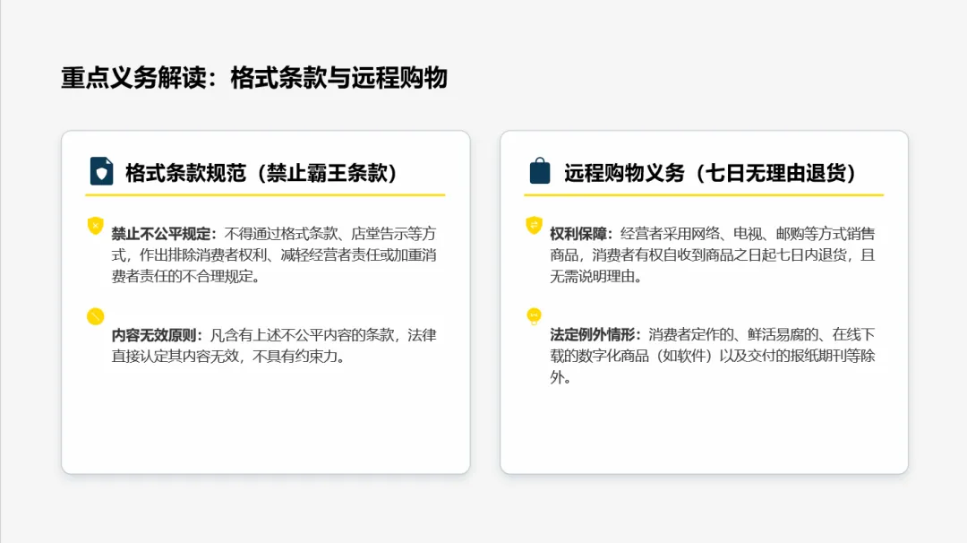 4.公平交易权(第10条):消费者享有公平交易的权利。在消费过程中,消费者有权获得质量保障、价格合理、计量正确的商品和服务,经营者不得利用优势地位制定不公平、不合理的交易条件,格式条款不得免除自身责任、加重消费者责任、排除消费者主要权利。例如,商家不得哄抬物价、缺斤短两,不得在格式合同中约定“一经售出概不退换”等霸王条款。