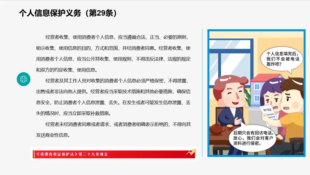7.获知权(第13条):消费者享有获得有关消费和消费者权益保护方面的知识的权利。经营者有义务向消费者提供消费知识和维权指导,政府、消协等部门也应通过多种渠道普及消费知识,帮助消费者提高自我保护意识和维权能力,避免因缺乏相关知识而遭受权益损害。