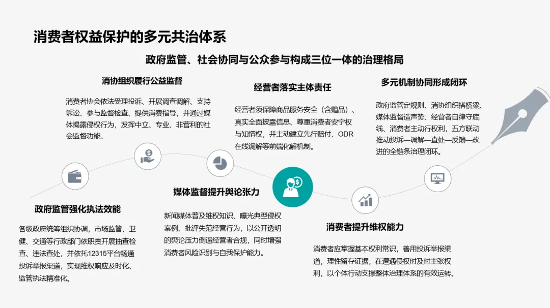 消费者权益的保护,不仅需要消费者自身维权、经营者自觉合规,还需要国家层面的监管和社会层面的监督,形成“政府监管、消协助力、媒体监督”的多元保护体系: