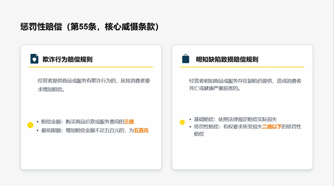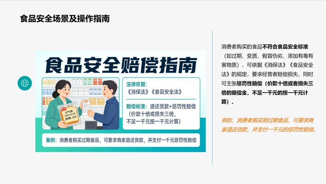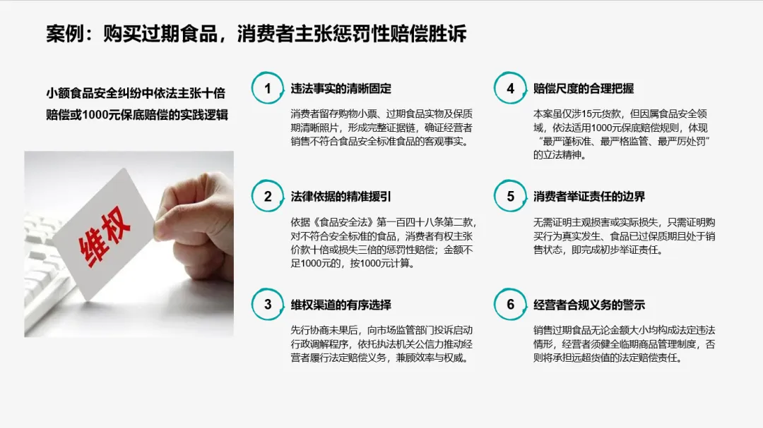 【核心启示】对应对照表中“食品安全问题”场景,即使涉案金额较小,消费者仍可依法主张惩罚性赔偿,留存购物凭证、问题食品实物是维权核心。