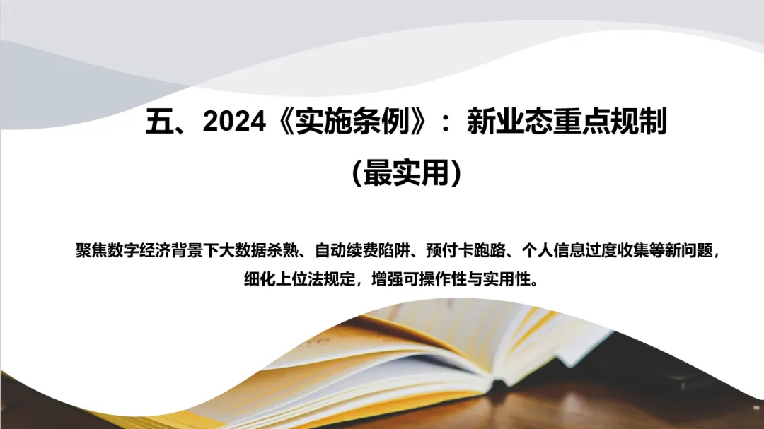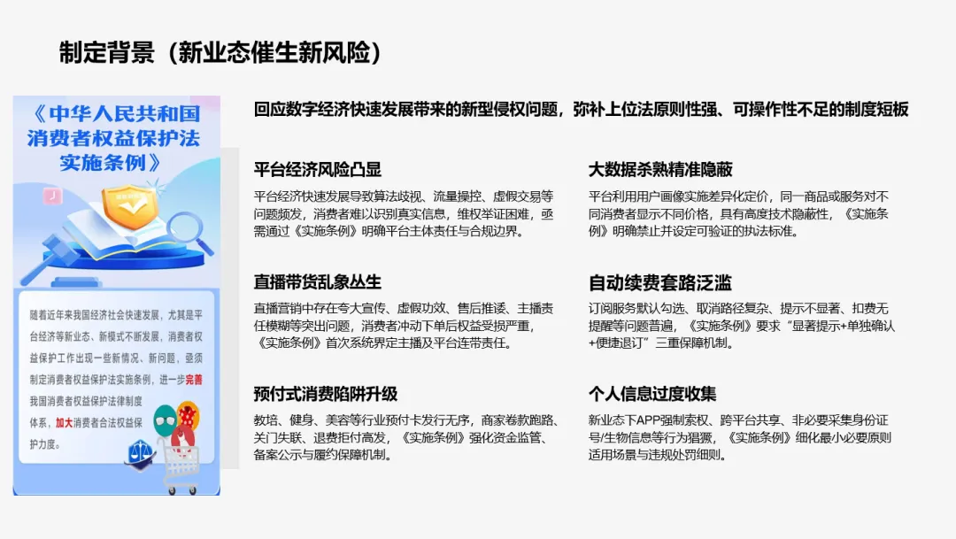 为《消保法》的配套行政法规,《消费者权益保护法实施条例》首次在行政法规层面,对大数据杀熟、强制搭售、预付式消费等新型侵权行为作出明确规制,细化了《消保法》的原则性规定,增强了法律的可操作性,形成了“法律+行政法规”的完整保护闭环,进一步破解了新型消费纠纷维权难的问题。
