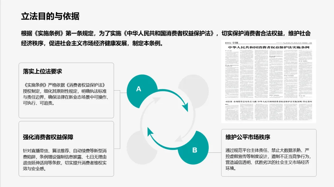 《中华人民共和国消费者权益保护法》是我国消费维权领域的基础性、纲领性法律,2024年《消费者权益保护法实施条例》的施行,进一步补齐了数字经济背景下消费监管的短板,细化了法律条款,增强了可操作性,形成了“法律+行政法规”的完整保护闭环,为消费者合法权益保护、市场秩序规范、市场经济健康发展提供了坚实的法律保障。