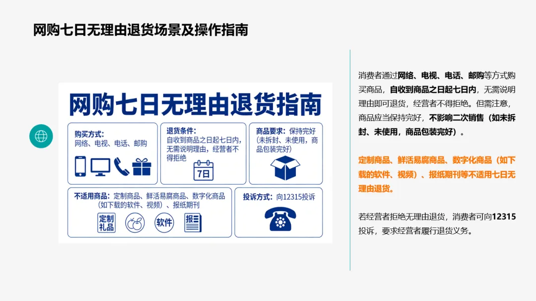 1.网购七日无理由退货场景:消费者通过网络、电视、电话、邮购等方式购买商品,自收到商品之日起七日内,无需说明理由即可退货,经营者不得拒绝。但需注意,商品应当保持完好,不影响二次销售(如未拆封、未使用,商品包装完好);定制商品、鲜活易腐商品、数字化商品(如下载的软件、视频)、报纸期刊等不适用七日无理由退货。若经营者拒绝无理由退货,消费者可向12315投诉,要求经营者履行退货义务。