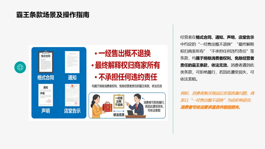2霸王条款场景:经营者在格式合同、通知、声明、店堂告示中约定的“一经售出概不退换”“最终解释权归商家所有”“不承担任何违约责任”等条款,均属于排除消费者权利、免除经营者责任的霸王条款,依法无效。消费者遇到此类条款,可拒绝履行,若因此遭受损失,可依法索赔。例如,消费者购买商品后发现质量问题,商家以“一经售出概不退换”为由拒绝退货,消费者可依法要求退货并赔偿损失。