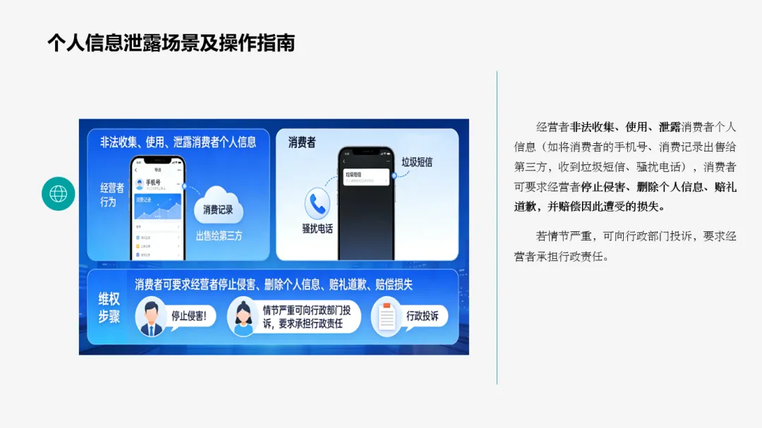 4.个人信息泄露场景:经营者非法收集、使用、泄露消费者个人信息(如将消费者的手机号、消费记录出售给第三方,收到垃圾短信、骚扰电话),消费者可要求经营者停止侵害、删除个人信息、赔礼道歉,并赔偿因此遭受的损失;若情节严重,可向行政部门投诉,要求经营者承担行政责任。