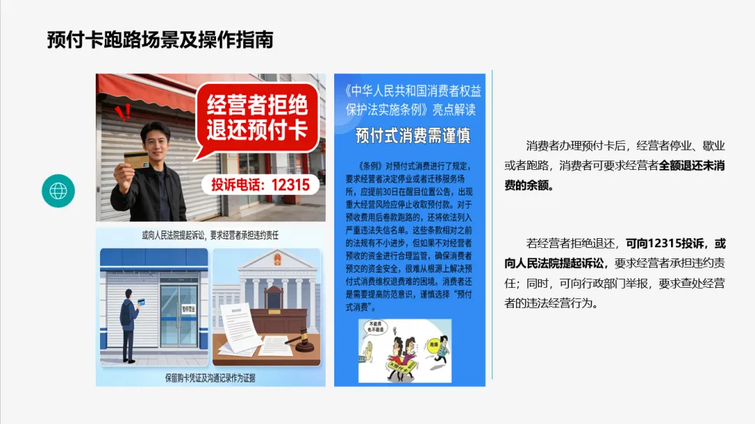 5.预付卡跑路场景:消费者办理预付卡后,经营者停业、歇业或者跑路,消费者可要求经营者全额退还未消费的余额;若经营者拒绝退还,可向12315投诉,或向人民法院提起诉讼,要求经营者承担违约责任;同时,可向行政部门举报,要求查处经营者的违法经营行为。