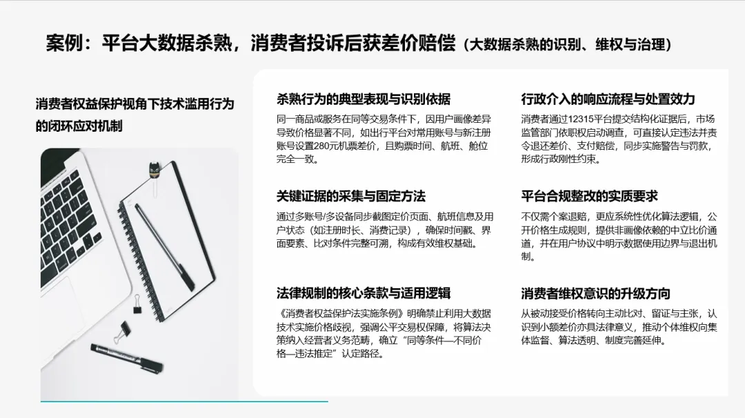 【核心启示】对应对照表中“商家大数据杀熟”场景,留存不同账号/设备的定价截图、消费记录是维权关键,即使差价金额不大,消费者也可依法主张退还差价并要求赔偿。