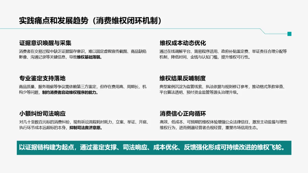 消费维权便捷化、线上化、一站式:未来将进一步畅通维权渠道,优化12315投诉举报平台,实现投诉、调解、查处的线上化办理,减少消费者的维权成本;将典型案例沉淀为监管线索、执法依据与规则修订参考,推动格式条款审查、平台算法透明、预付资金监管等源头治理升级,进一步推动建立一站式消费维权机制,整合消协、行政部门、仲裁机构、法院等多方资源,为消费者提供便捷、高效的维权服务,让消费者“维权不再难”。