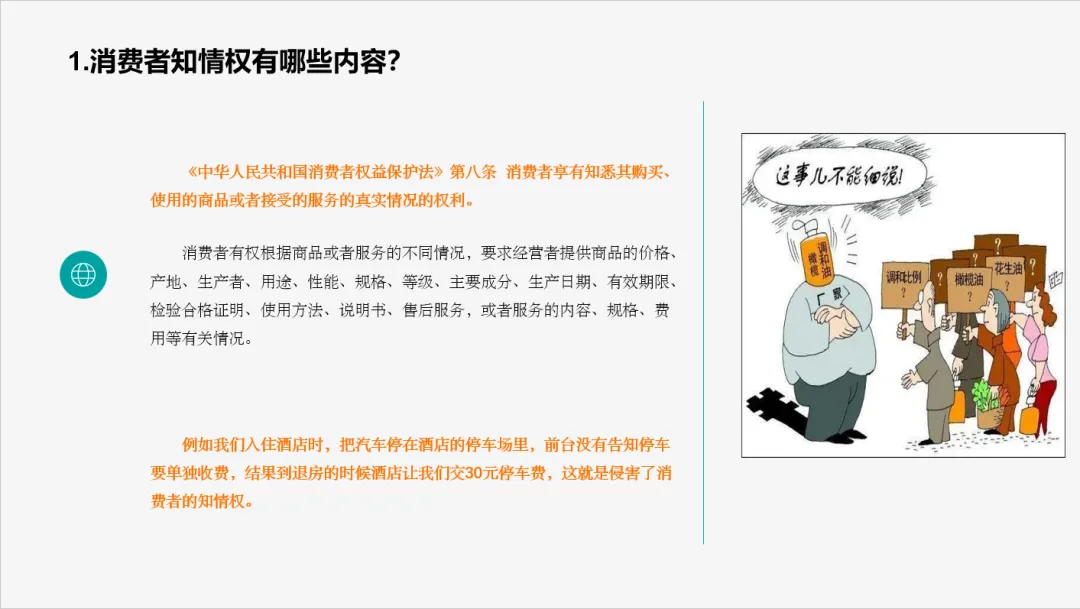 2.知情权(第8条):消费者享有知悉其购买、使用的商品或者接受的服务的真实情况的权利。经营者必须主动向消费者提供商品的价格、产地、生产者、用途、性能、规格、等级、主要成分、生产日期、有效期限、检验合格证明、使用方法说明书、售后服务等相关信息,禁止虚假宣传、隐瞒关键信息。例如,商家不得将“三无产品”伪装成合格产品,不得隐瞒商品的瑕疵(如二手商品未告知使用痕迹)。