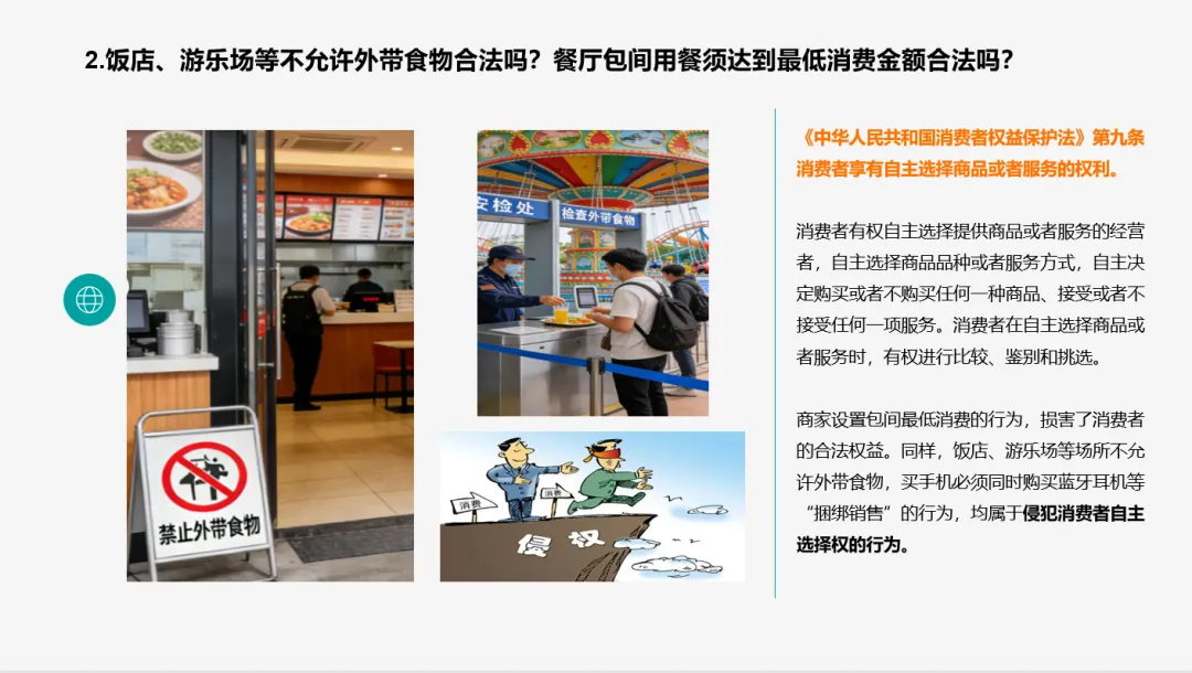 2.饭店、游乐场等不允许外带食物合法吗?餐厅包间用餐须达到最低消费金额合法吗?