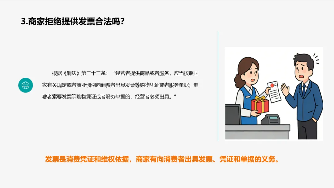 根据《消法》第二十二条:“经营者提供商品或者服务,应当按照国家有关规定或者商业惯例向消费者出具发票等购物凭证或者服务单据;消费者索要发票等购物凭证或者服务单据的,经营者必须出具。”发票是消费凭证和维权依据,商家有向消费者出具发票、凭证和单据的义务。