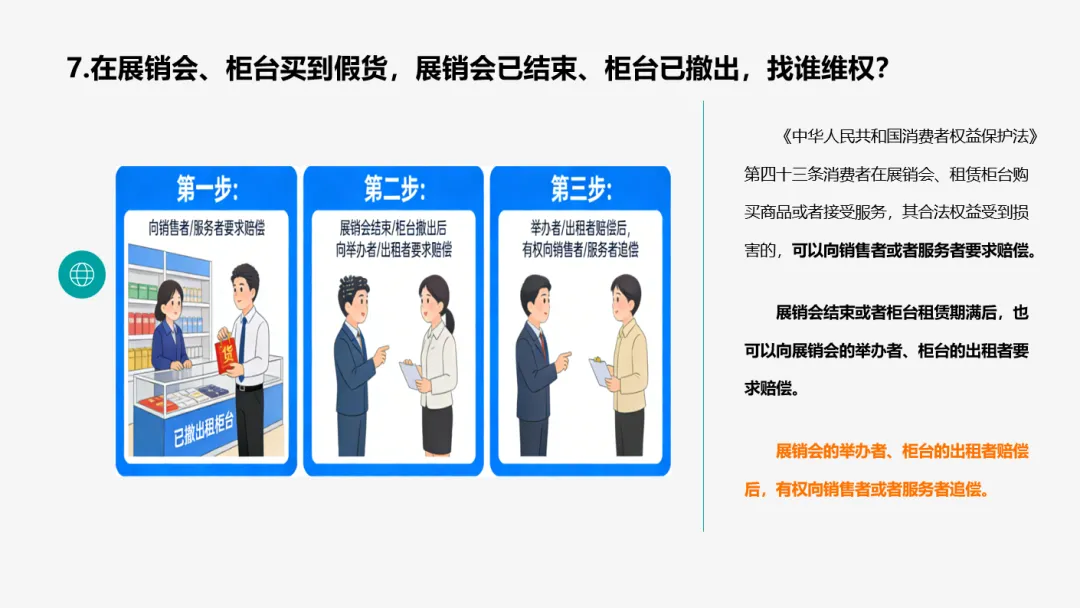 7.在展销会、柜台买到假货,展销会已结束、柜台已撤出,找谁维权?