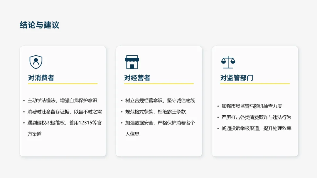 对监管部门:要强化监管责任,加大对消费市场的监管力度,定期开展商品质量抽查、经营者合规检查,严厉查处侵害消费者权益的违法行为;畅通投诉举报渠道,优化12315平台的办理流程,提高投诉处理效率;加强消费维权知识的宣传普及,引导消费者依法维权、经营者合规经营;完善相关配套制度,破解举证难、鉴定难、小额诉讼成本高的痛点,推动消费维权工作高质量发展。