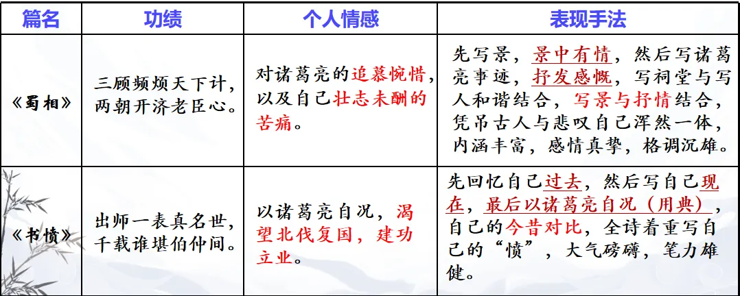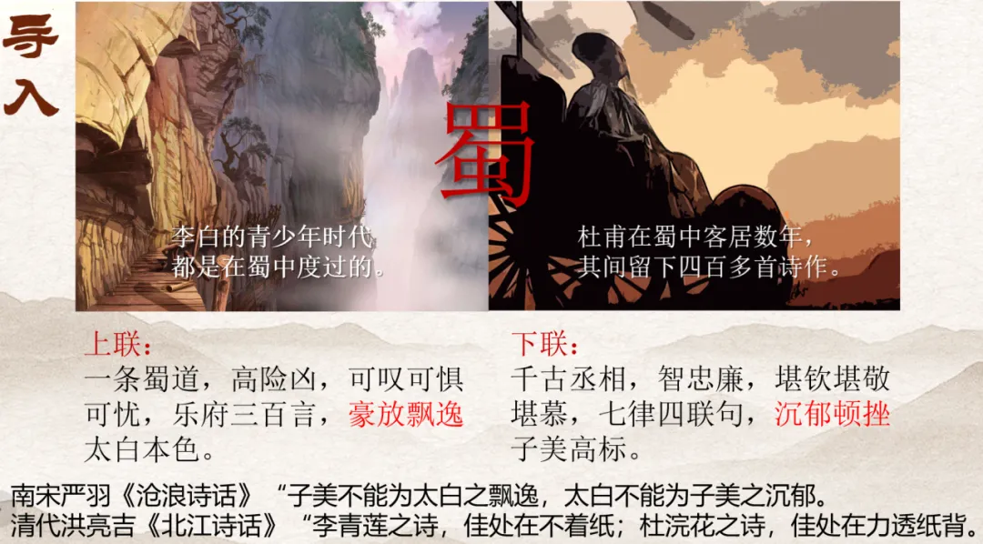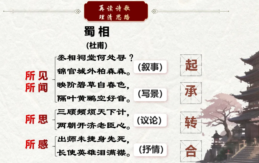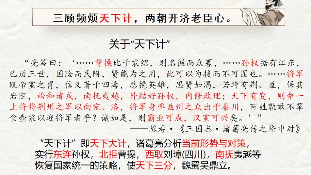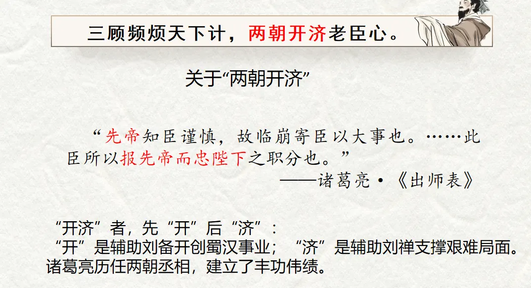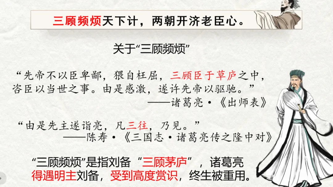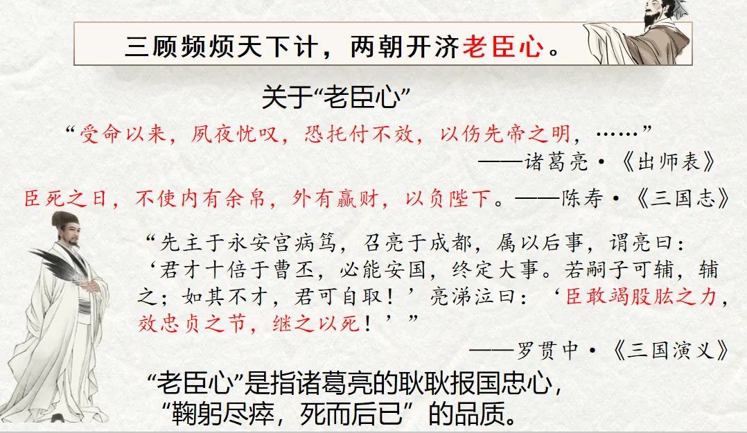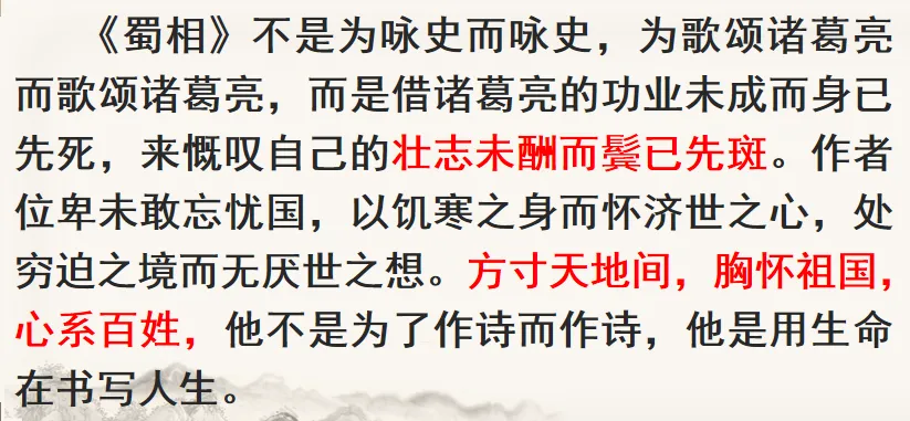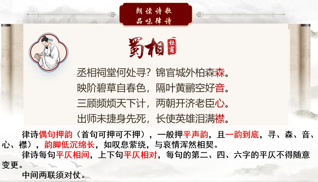 《蜀相》是诗人杜甫七律中的名篇,为杜甫游成都诸葛武侯祠时所作,“武侯”是诸葛亮的谥号。公元221年,刘备在成都称帝,定国号为蜀,任命诸葛亮为丞相,蜀相的意思是蜀国的丞相。诗题《蜀相》,写的就是诸葛亮。诸葛亮是三国时期著名的政治家和军事家。他曾经为刘备制定了一系列统一天下的方略,辅佐刘备振兴汉室,建立了蜀汉政权,形成了与曹魏、孙吴三足鼎立之局面。刘备去世后,诸葛亮又辅佐刘备的儿子刘禅,多次出师北伐中原,因身心交瘁,积劳成疾,最后身死五丈原,实现了他“鞠躬尽瘁,死而后已”的铿锵誓言,赢得了后世人们的景仰和推崇。