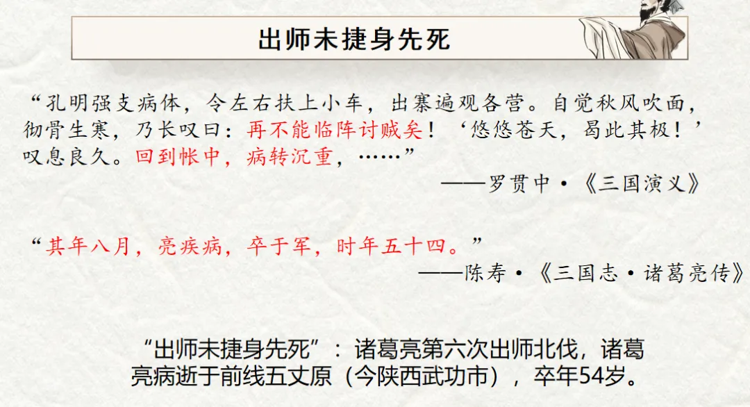 根据史料记载,公元234年春,诸葛亮再度率军伐魏,屯兵五丈原,于渭河对战魏将司马懿。经过百余日的相持,诸葛亮积劳成疾,并于同年八月病逝。“出师未捷身先死”即是对这一历史事件的总括和追忆。