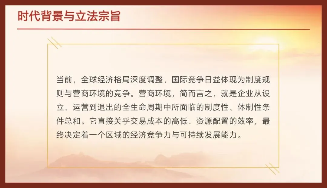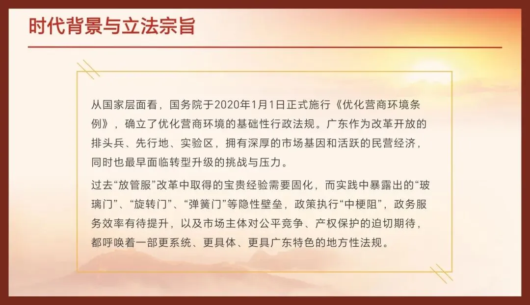 因此,《广东省优化营商环境条例》的出台,是贯彻落实习近平总书记重要指示精神和国家《优化营商环境条例》的必然要求,是总结提炼我省改革实践经验、将行之有效的措施上升为法律制度的法治化成果,更是直面当前痛点、堵点、难点,以法治方式推动我省营商环境实现根本性提升的战略举措。它标志着广东优化营商环境工作从依靠政策推动,全面转入法治化、规范化、长效化的新阶段。《条例》于2022年7月1日起施行,为我省在高起点上推进高质量发展提供了坚实的法治保障。
