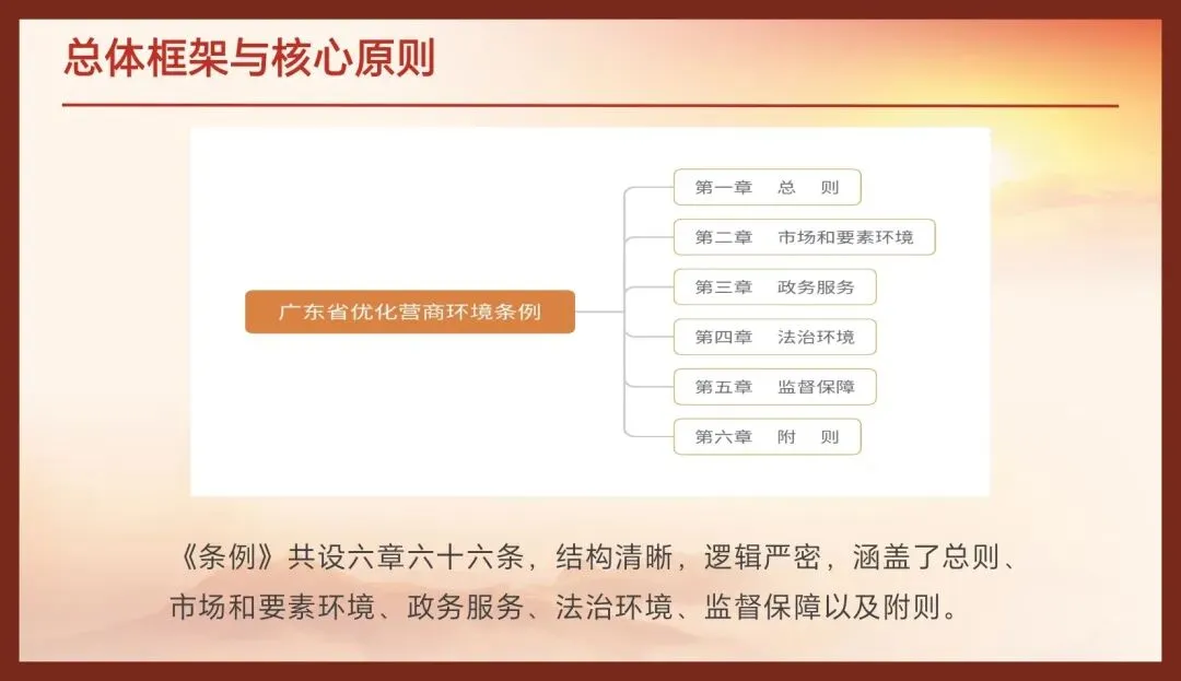 《条例》共设六章六十六条,结构清晰,逻辑严密,涵盖了总则、市场和要素环境、政务服务、法治环境、监督保障以及附则。其内容并非简单照搬上位法,而是紧密结合广东实际,进行了大量细化和创新,体现了很强的问题导向和可操作性。