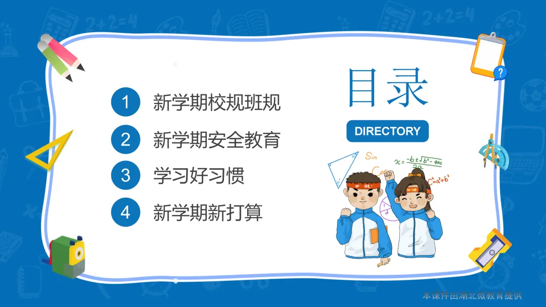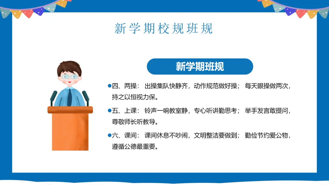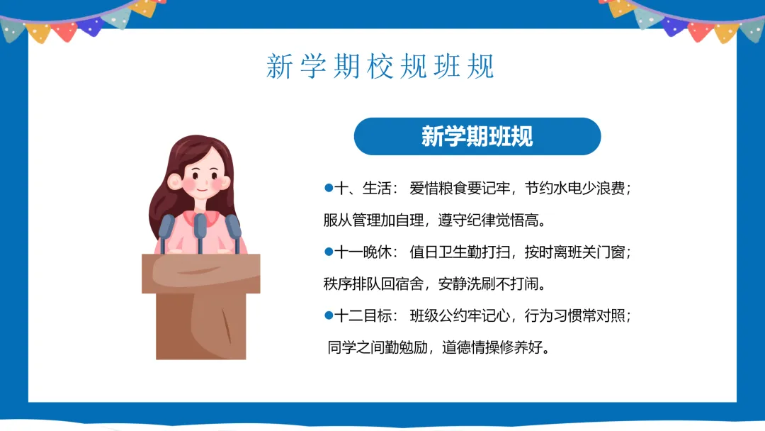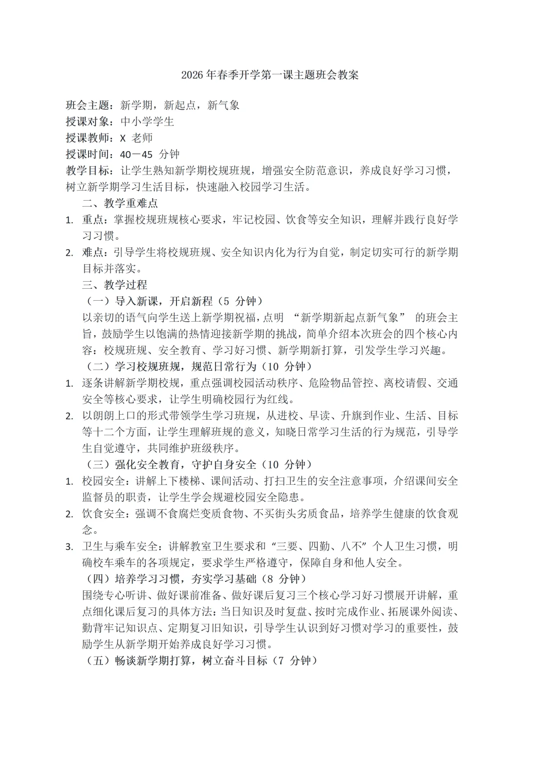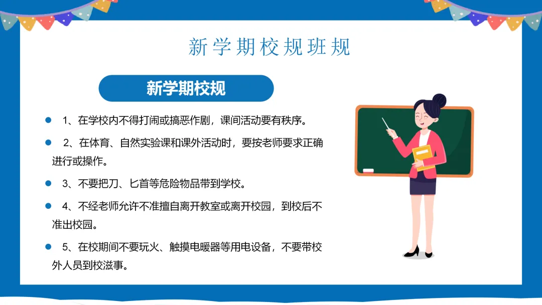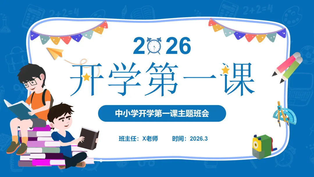 本课件为 2026 年春季中小学开学第一课主题班会专用,围绕校规班规、安全教育、学习好习惯、新学期新打算四大核心展开,内容贴合校园日常,条款清晰、要求明确,兼具行为规范指导与成长引导,助力学生快速收心,以新面貌开启新学期校园生活。