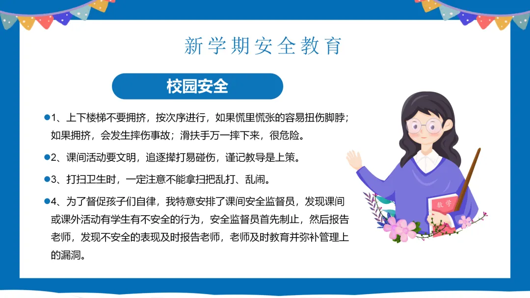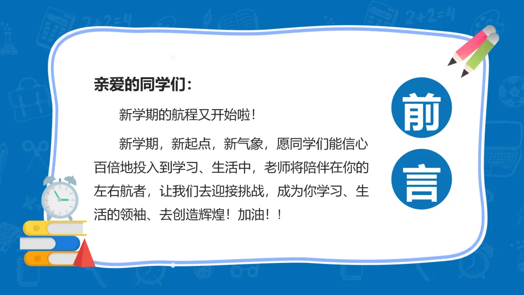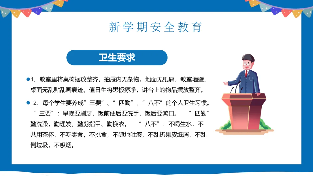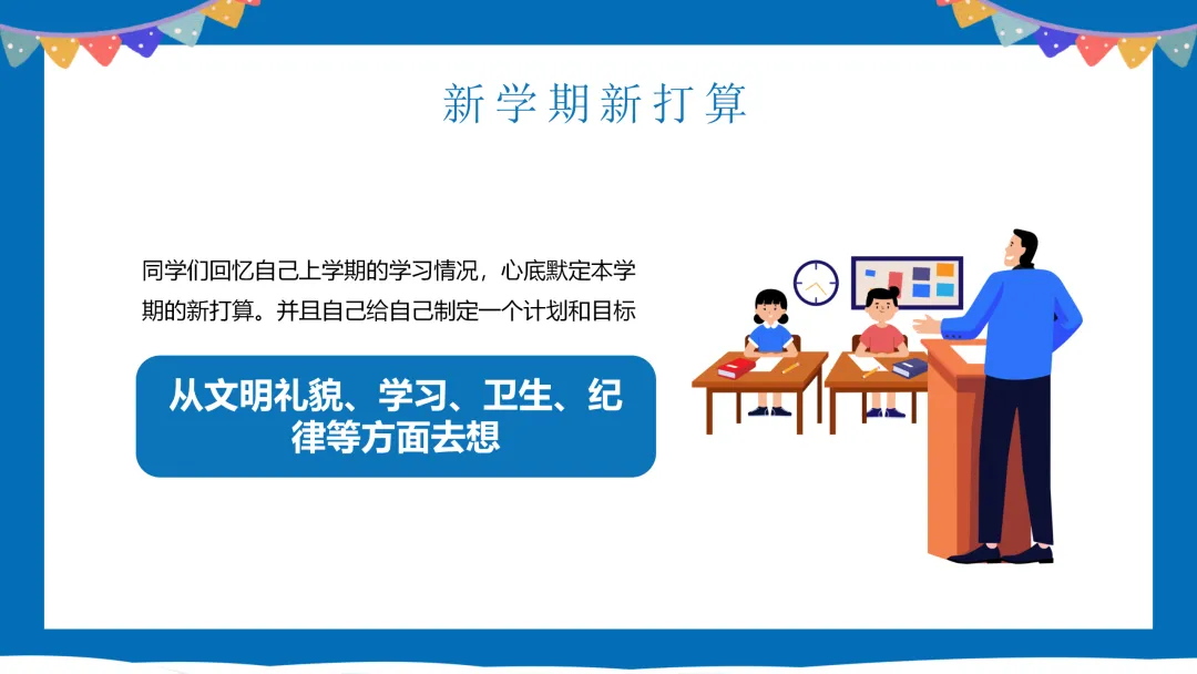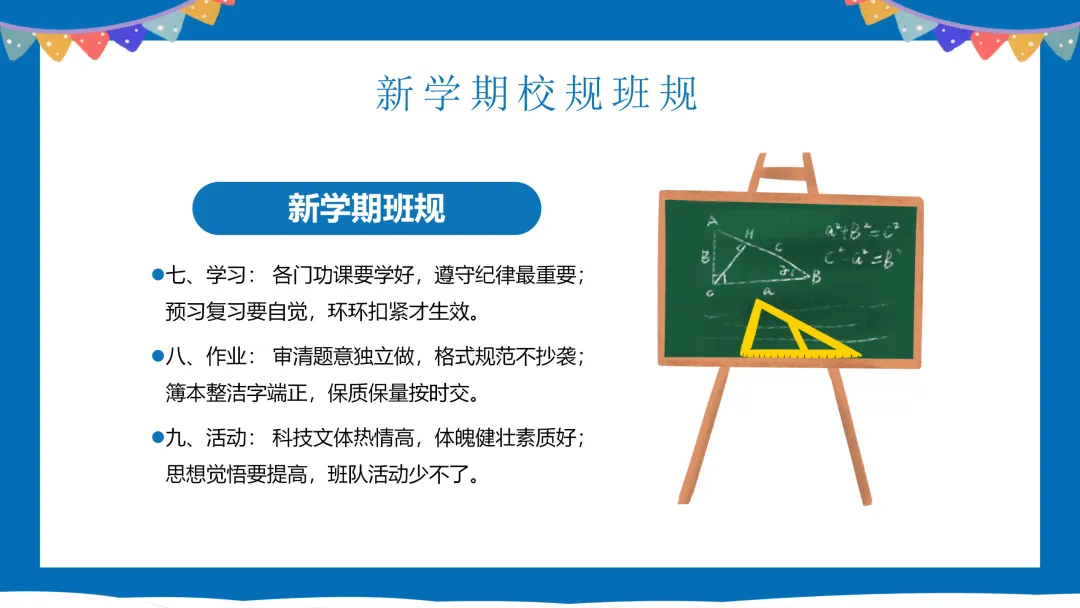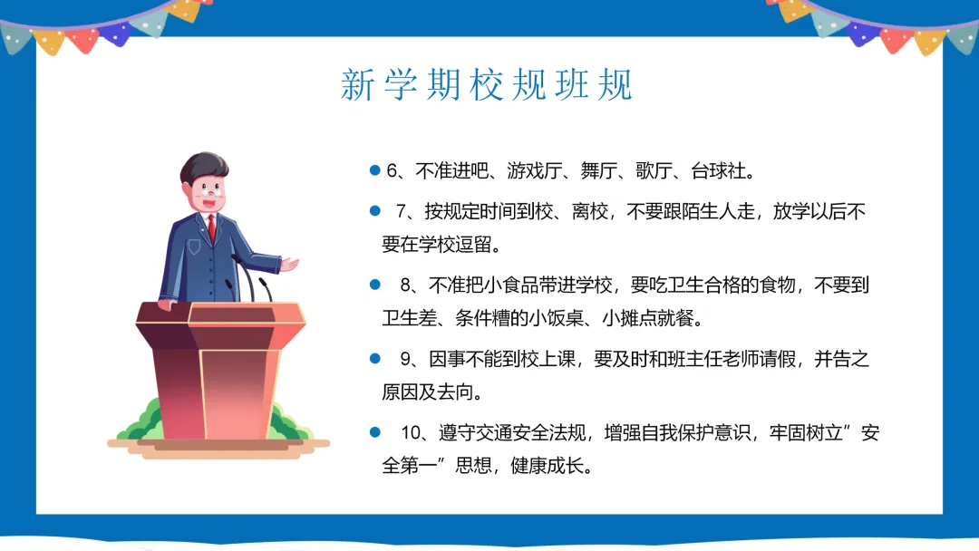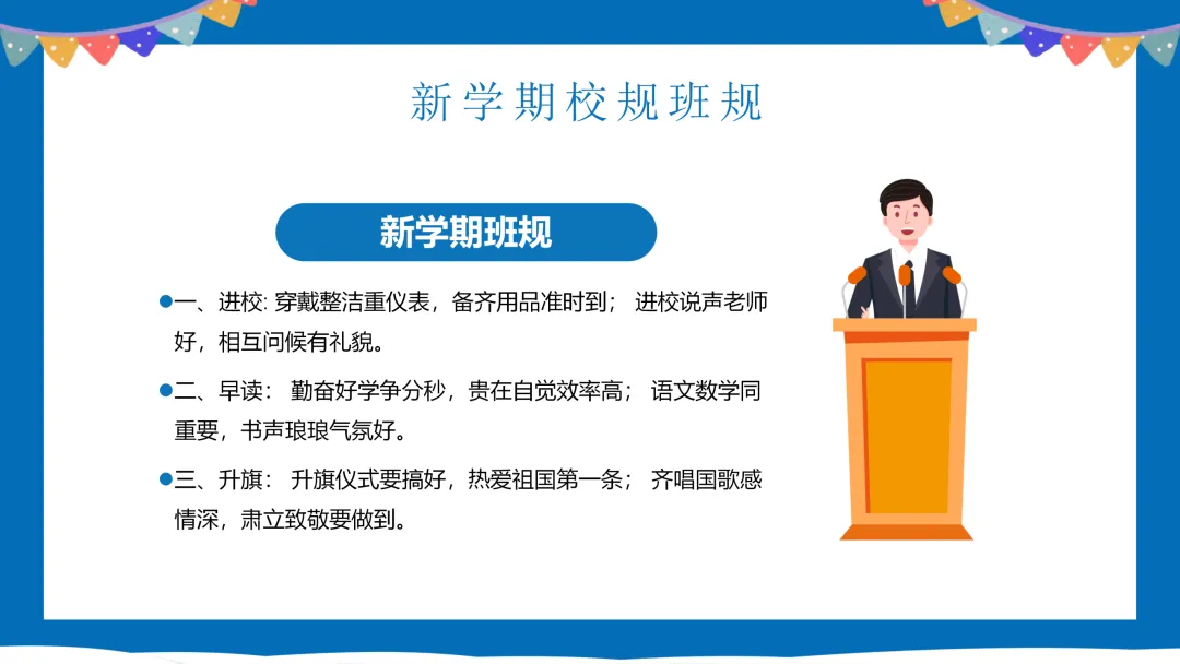 本课件为 2026 年春季中小学开学第一课主题班会专用,围绕校规班规、安全教育、学习好习惯、新学期新打算四大核心展开,内容贴合校园日常,条款清晰、要求明确,兼具行为规范指导与成长引导,助力学生快速收心,以新面貌开启新学期校园生活。