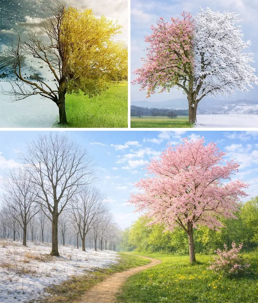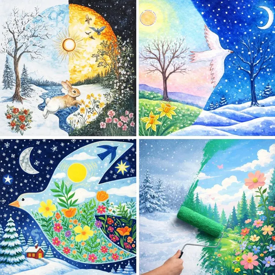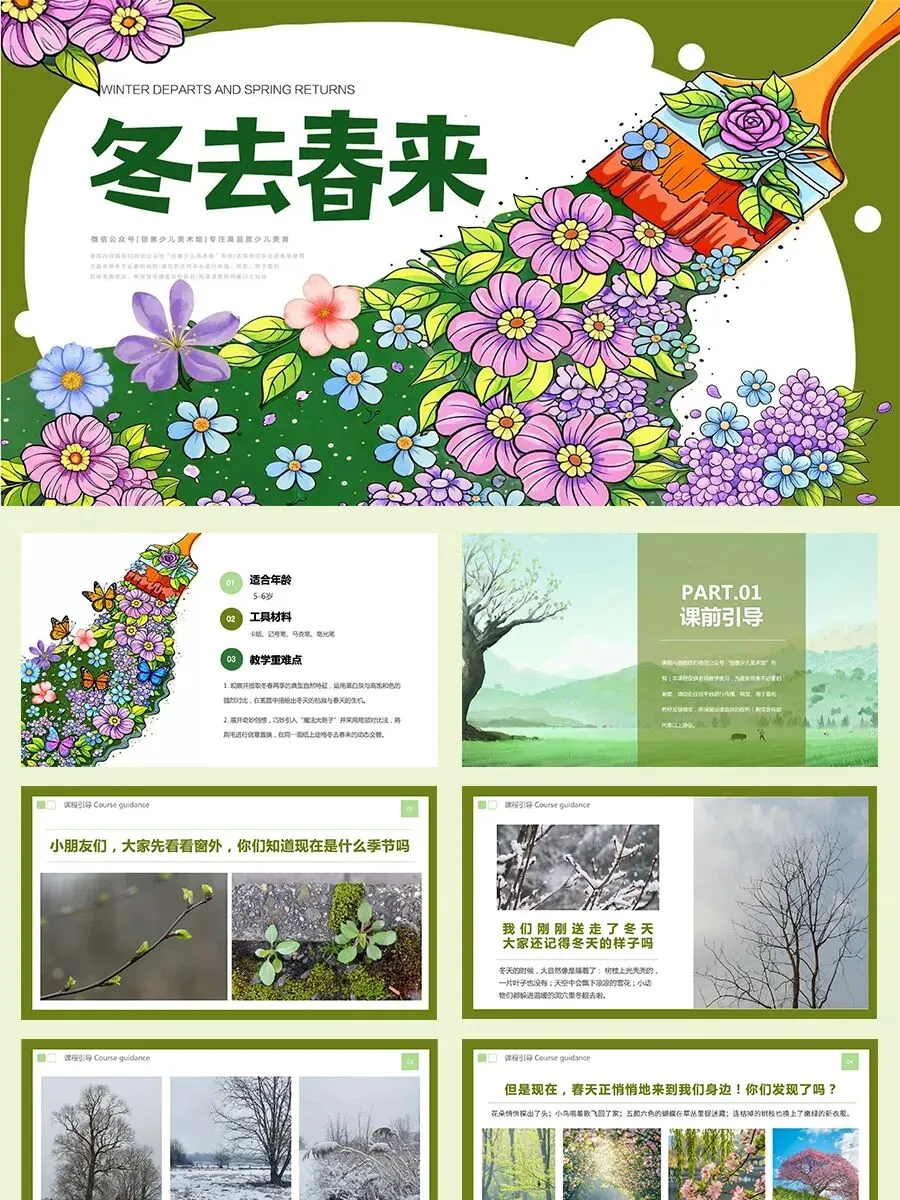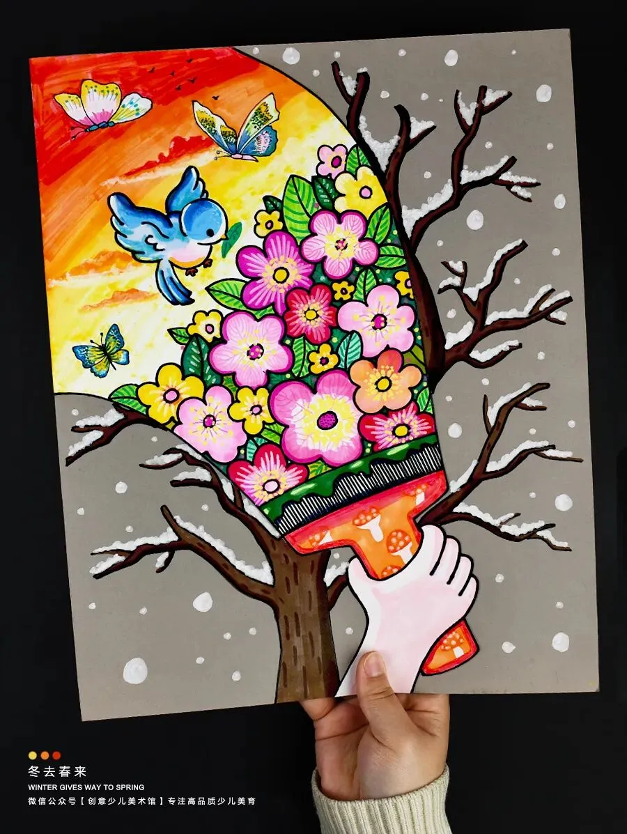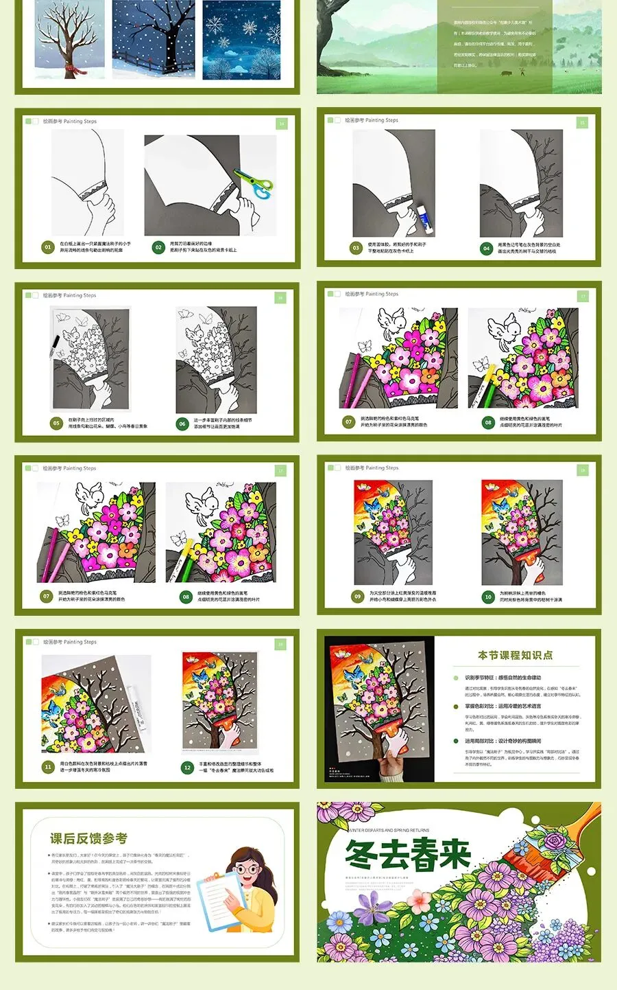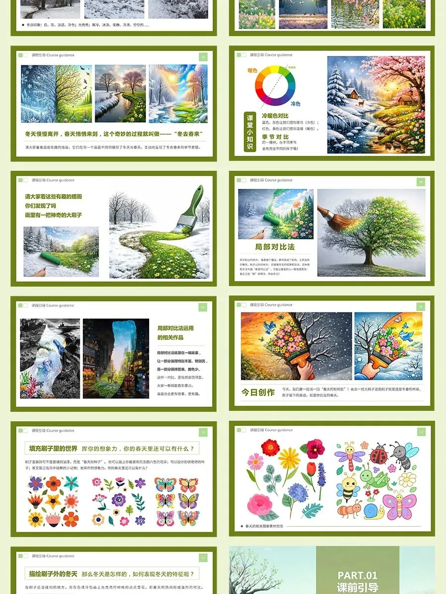 原来,大自然正在进行一场神奇的变化,这个变化就叫做“冬去春来”。如果把冬天和春天画在同一张画纸上,会发生什么呢?冬天的颜色多是蓝色、灰色、白色,让人感觉冷冷的;春天的颜色是红色、黄色、绿色,让人感觉暖洋洋的、充满生命力。同一棵树,在冬天是光秃秃的,在春天却长满了嫩绿的叶子,这就是季节的变化。