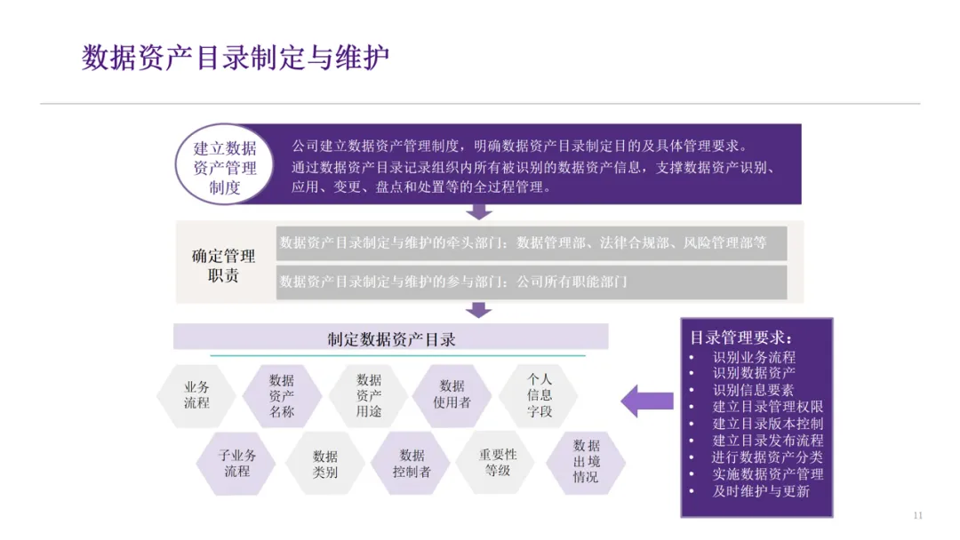 首先明确数据资产定义,其作为新型生产要素,是组织合法拥有、可计量且能带来价值的数据资源,具备可控制、可量化等特征,分为个人、企业、国家层面数据资产。数据资产识别需从业务流程切入,梳理子流程与对应数据资产,提取信息要素。同时需建立并维护数据资产目录,明确管理职责,由多部门协同制定,实现数据资产全流程管控。