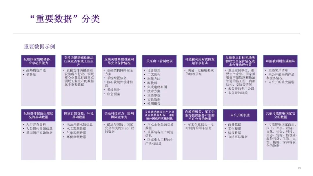 重要数据分类:明确重要数据定义与识别原则,按影响对象和程度分级,列举了战略物资、地理信息等重要数据示例,且需按流程完成核心、重要数据的判定与定级。