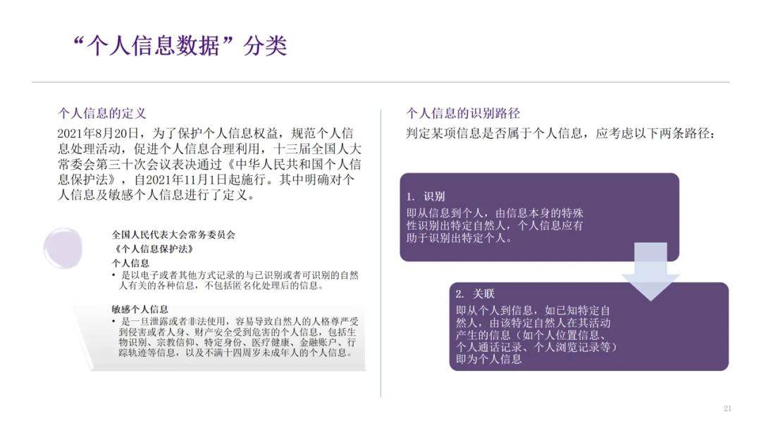 个人信息分类:依据《个人信息保护法》界定个人信息与敏感个人信息范围,明确识别路径,敏感信息包含生物识别、医疗健康等,同时明确其监管与出境管理要求。