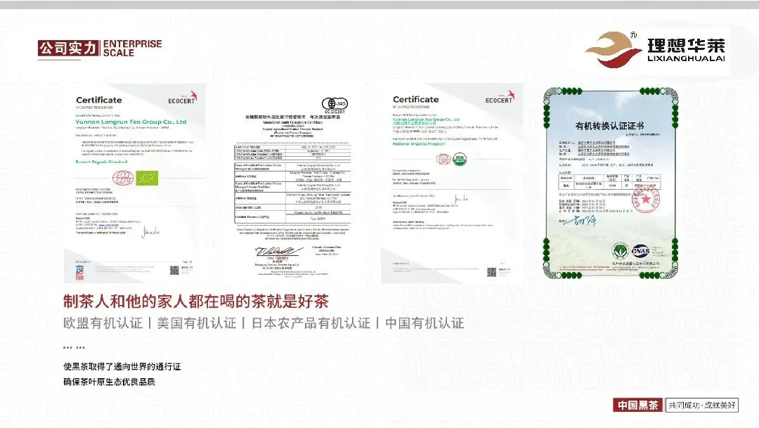 理想华莱拥有六项国际权威认证,确保茶叶生态优良品质:
