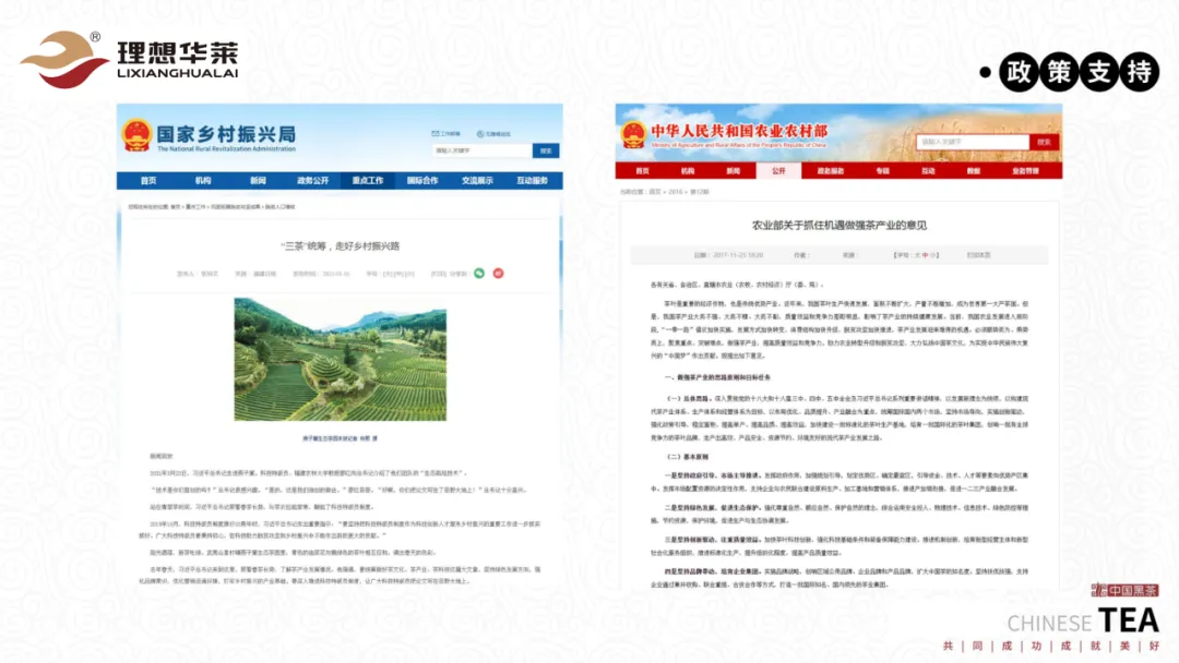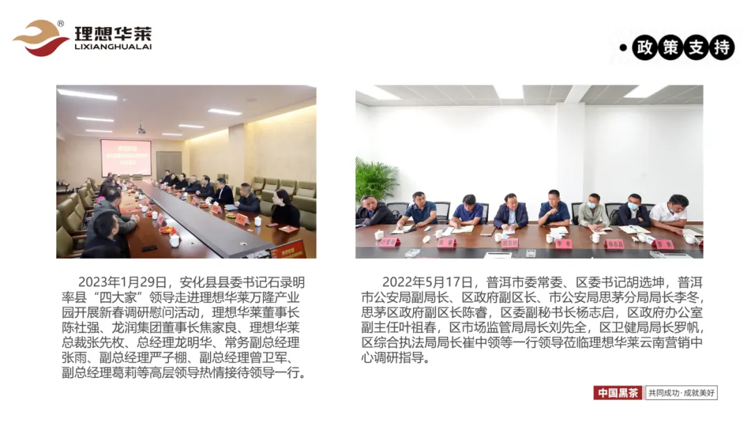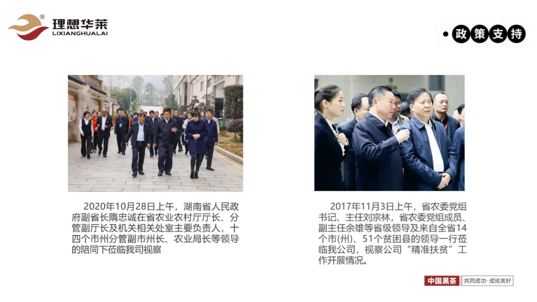 地方层面:湖南省政府推动“打造千亿黑茶,三茶统筹”。 高管如陈设强(第十二、十三届人大代表)、焦家良(中共中央党组科座教授)参与国家两会三农讨论;公司为公安局重点保护企业,冷市派出所设理想华莱警务室。