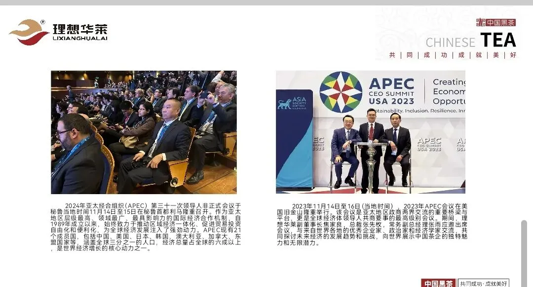 2024年APEC秘鲁利马峰会:聚焦数字经济赋能产业升级新路径2024年11月,APEC第三十一次领导人非正式会议在秘鲁利马举行,“数字驱动亚太可持续增长”成为峰会核心议题。理想华莱总裁陈社强受邀参会,代表中国茶企在“传统产业数字化转型”分论坛发表主旨演讲。陈社强在演讲中详细介绍了理想华莱的数字化转型实践:通过搭建“智慧茶园管理系统”,实现茶叶种植全程数据化监测;开发线上茶文化传播与销售平台,2023年线上销售额占比达35%;借助跨境电商直播,打造“安化黑茶全球品鉴日”活动,单场直播吸引超50万海外观众。峰会期间,理想华莱与秘鲁当地农业机构及电商平台签署两项合作协议,计划在秘鲁设立安化黑茶展示中心;理想华莱是一家具备规模化、现代化、标准化、产业化、功能齐备、链条完整的,集研发、加工、生产、文化休闲、旅游度假于一体的大型综合性产业集群,截止2025年总投资120亿,税收21亿,累计创造50万关联就业岗位。中国黑茶共同成功·成就美好