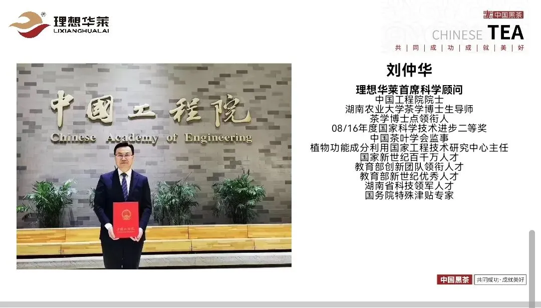 刘仲华院士作为今天整个理想华莱的首席顾问,很多人就觉得今天是有了这家公司,那刘仲华落户今天的理想华莱吗?不是的,理想华莱截止到现在跨15年的时间,那刘仲华院士带着他的科研团队已经研究中国的黑茶30多年了,他用十年的时间写了一本书,他在08年的时候,他的书就已经得到了国家科技二等奖,只是源于今天的理想华莱,整个科研团队落户在今天的理想华莱,今天的中国黑茶不属于哪个省份,不属于哪个公司,它是属于国家科研项目,所以我们也是唯一一个得到国家科研经费1,200万的一个茶企。