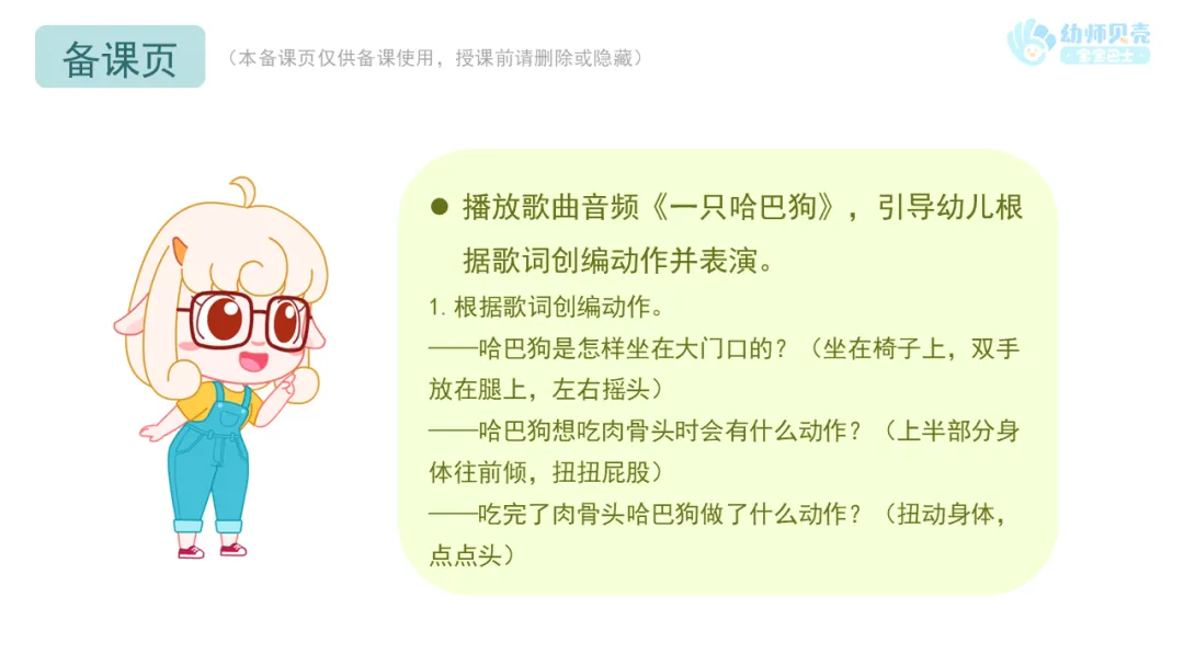 l播放歌曲音频《一只哈巴狗》,引导幼儿根据歌词创编动作并表演。