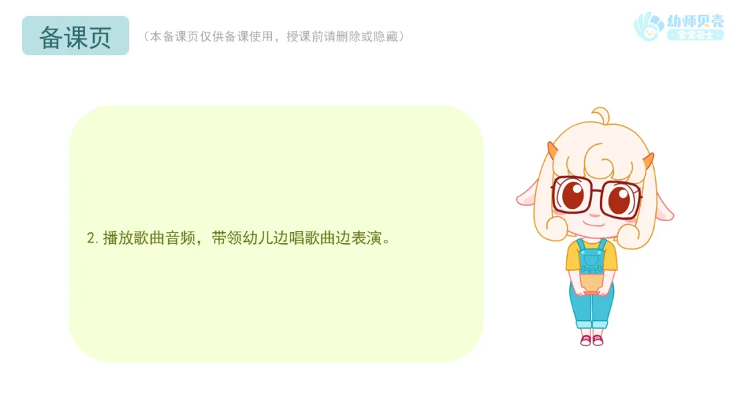 2.播放歌曲音频,带领幼儿边唱歌曲边表演。