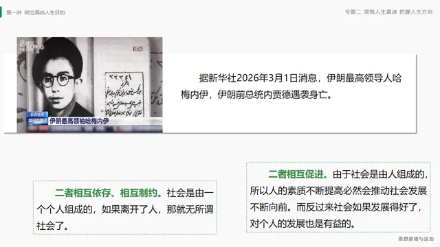 再次,二者相互促进。由于社会是由人组成的,所以人的素质不断提高必然会推动社会发展不断向前。而反过来社会如果发展得好了,对个人的发展也是有益的。我们国家富强了,人民才能幸福。如果动乱,个人的发展也是无从谈起的。2026年2月末,美以发动对伊朗的袭击,伊朗最高领袖哈梅内伊、伊朗前总统内贾德遇袭身亡。我们来看一个视频。