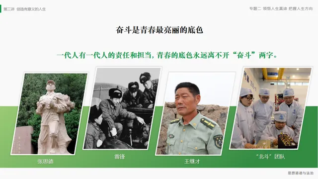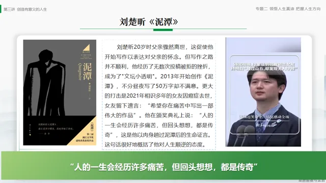【P2】同学们,大家好!欢迎来到今天的课堂。在我们漫长而又短暂的人生旅途中,每个人都在寻找着属于自己的那份意义和价值。有的人在探索中迷茫,有的人在奋斗中坚定。但无论如何,创造一个有意义的人生,是我们共同的目标和追求。今天,我们将一起踏上一场关于“创造有意义的人生”的探索之旅。在这场旅程中,我们将思考什么是有意义的人生,如何设定并实现自己的人生目标,以及如何在面对挑战和困难时保持坚韧不拔。