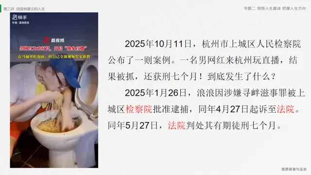 【P4】各位同学我们在上一节课呢,学习了人生目的,人生价值这样一些内容。这些内容其实和我们日常生活是紧密相关的,比如说人生价值,要实现人生价值最根本的途径就是参与社会实践,或者换一种比较流行的说法是,找个班上,或者找一个工作,这是实现我们人生价值的基本途径。那么在此,我想提问各位同学一个问题,你未来理想的工作是什么?对此,大家刚刚进入大学对人生还缺乏规划,还没有想清楚、想明白,但是大家还是要尽快思考一下这个问题,毕竟人生目的决定人生道路吗。在此,我想问大家一个问题:你们有没有想过从事快递行业呀?我想可能很多同学没有这样想过,或者认为如果从事这样的服务行业不能彰显我的价值,事实真是如此吗?接下来我们看一下少瑞强的事迹。