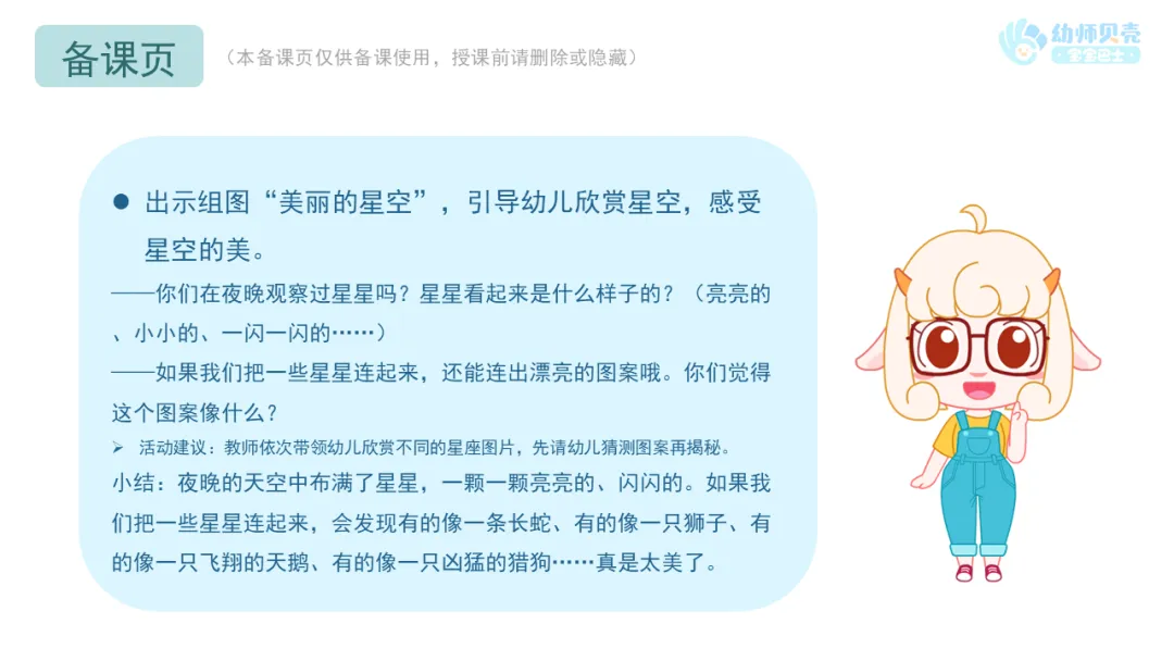 Ø活动建议:教师依次带领幼儿欣赏不同的星座图片,先请幼儿猜测图案再揭秘。