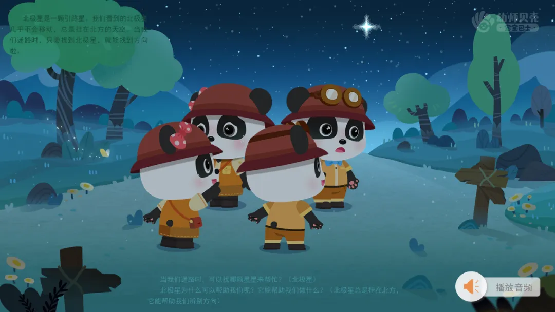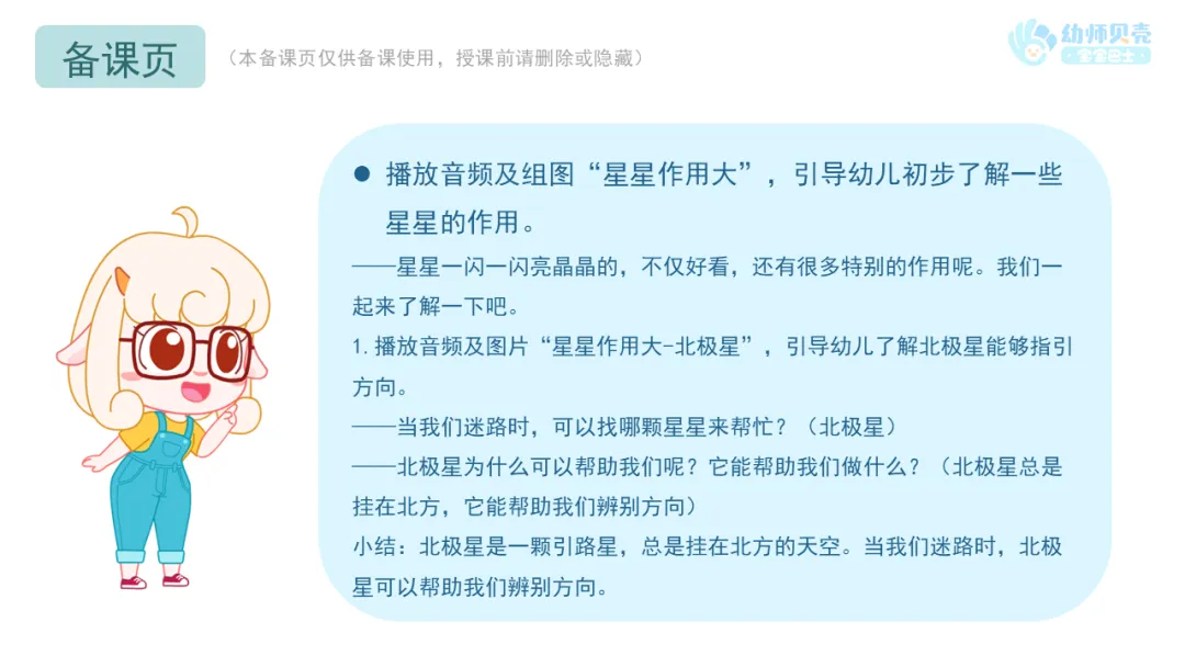 1.播放音频及图片“星星作用大-北极星”,引导幼儿了解北极星能够指引方向。